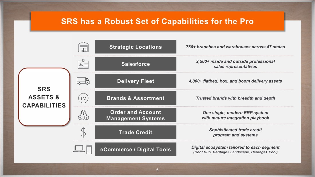 CONFIDENTIAL SRS’s Strong Performance and Track Record of Growth Notes : 2023 revenue and adjusted EBITDA are unaudited for fiscal year end 12/31/23. Adjusted EBITDA includes full year impact of acquisitions. MULTI - FACETED GROWTH APPROACH Same - Store Sales Greenfields M&A Digital NOW OPEN ~ $1.1B 2023 ADJUSTED EBITDA ~ $10B 2023 REVENUE Entered in 2008 Entered in 2019 Entered in 2021 ROOFING & BUILDING PRODUCTS LANDSCAPE POOL 5