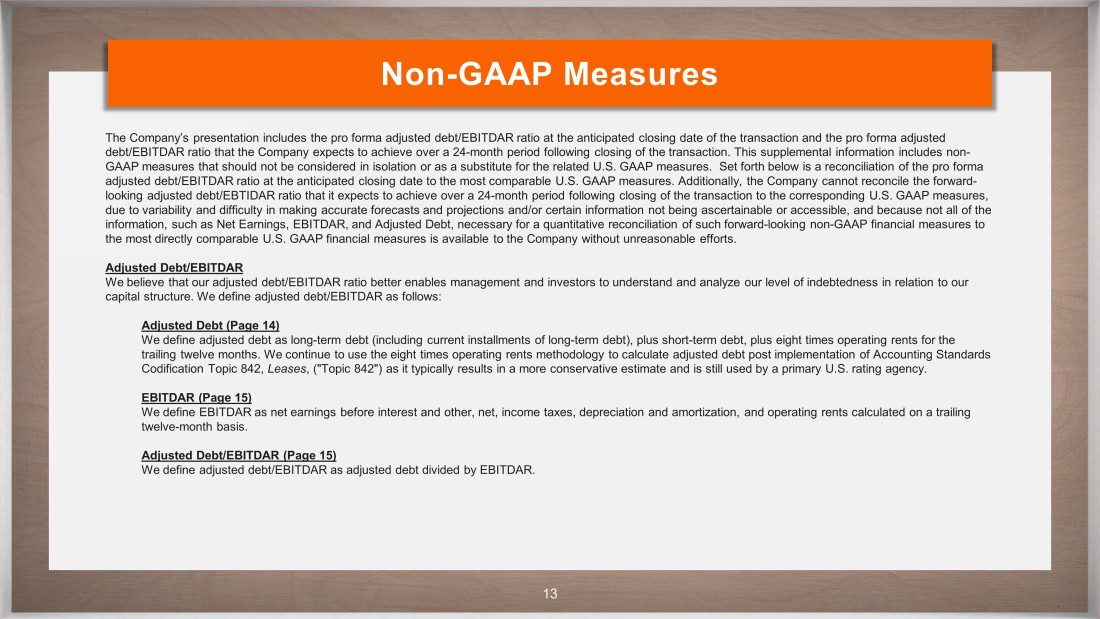 CONFIDENTIAL 13 Non - GAAP Measures The Company’s presentation includes the pro forma adjusted debt/EBITDAR ratio at the anticipated closing date of the transact ion and the pro forma adjusted debt/EBITDAR ratio that the Company expects to achieve over a 24 - month period following closing of the transaction. This supplem ental information includes non - GAAP measures that should not be considered in isolation or as a substitute for the related U.S. GAAP measures. Set forth be low is a reconciliation of the pro forma adjusted debt/EBITDAR ratio at the anticipated closing date to the most comparable U.S. GAAP measures. Additionally, the Comp any cannot reconcile the forward - looking adjusted debt/EBTIDAR ratio that it expects to achieve over a 24 - month period following closing of the transaction to th e corresponding U.S. GAAP measures, due to variability and difficulty in making accurate forecasts and projections and/or certain information not being ascertain abl e or accessible, and because not all of the information, such as Net Earnings, EBITDAR, and Adjusted Debt, necessary for a quantitative reconciliation of such forward - looki ng non - GAAP financial measures to the most directly comparable U.S. GAAP financial measures is available to the Company without unreasonable efforts. Adjusted Debt/EBITDAR We believe that our adjusted debt/EBITDAR ratio better enables management and investors to understand and analyze our level o f i ndebtedness in relation to our capital structure. We define adjusted debt/EBITDAR as follows: Adjusted Debt (Page 14 ) We define adjusted debt as long - term debt (including current installments of long - term debt), plus short - term debt, plus eight t imes operating rents for the trailing twelve months. We continue to use the eight times operating rents methodology to calculate adjusted debt post implem ent ation of Accounting Standards Codification Topic 842, Leases , ("Topic 842") as it typically results in a more conservative estimate and is still used by a primary U.S. rating agency. EBITDAR (Page 15 ) We define EBITDAR as net earnings before interest and other, net, income taxes, depreciation and amortization, and operating ren ts calculated on a trailing twelve - month basis. Adjusted Debt/EBITDAR (Page 15 ) We define adjusted debt/EBITDAR as adjusted debt divided by EBITDAR.