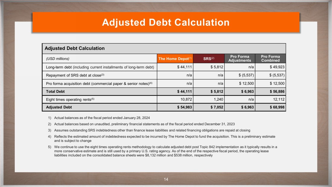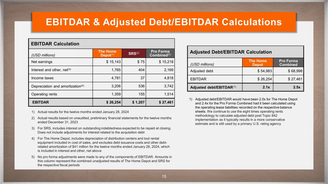 CONFIDENTIAL 14 Adjusted Debt Calculation Adjusted Debt Calculation (USD millions) The Home Depot (1) SRS (2) Pro Forma Adjustments Pro Forma Combined Long - term debt (including current installments of long - term debt) $ 44,111 $ 5,812 n/a $ 49,923 Repayment of SRS debt at close (3) n/a n/a $ (5,537) $ (5,537) Pro forma acquisition debt (commercial paper & senior notes) (4) n/a n/a $ 12,500 $ 12,500 Total D ebt $ 44,111 $ 5,812 $ 6,963 $ 56 , 886 Eight times operating rents (5 ) 10,872 1,240 n/a 12,112 Adjusted D ebt $ 54,983 $ 7,052 $ 6,963 $ 68,998 1) Actual balances as of the fiscal period ended January 28, 2024 2) Actual balances based on unaudited, preliminary financial statements as of the fiscal period ended December 31, 2023 3) Assumes outstanding SRS indebtedness other than finance lease liabilities and related financing obligations are repaid at clo sin g 4) Reflects the estimated amount of indebtedness expected to be incurred by The Home Depot to fund the acquisition. This is a pr eli minary estimate and is subject to change 5) We continue to use the eight times operating rents methodology to calculate adjusted debt post Topic 842 implementation as it ty pically results in a more conservative estimate and is still used by a primary U.S. rating agency. As of the end of the respective fiscal period, the operating lease liabilities included on the consolidated balance sheets were $8,132 million and $538 million, respectively