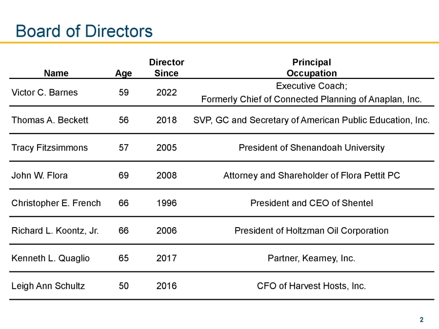 Principal Occupation Director Since Age Name Executive Coach; Formerly Chief of Connected Planning of Anaplan, Inc. 2022 59 Victor C. Barnes SVP, GC and Secretary of American Public Education, Inc. 2018 56 Thomas A. Beckett President of Shenandoah University 2005 57 Tracy Fitzsimmons Attorney and Shareholder of Flora Pettit PC 2008 69 John W. Flora President and CEO of Shentel 1996 66 Christopher E. French President of Holtzman Oil Corporation 2006 66 Richard L. Koontz, Jr. Partner, Kearney, Inc. 2017 65 Kenneth L. Quaglio CFO of Harvest Hosts, Inc. 2016 50 Leigh Ann Schultz Board of Directors 2