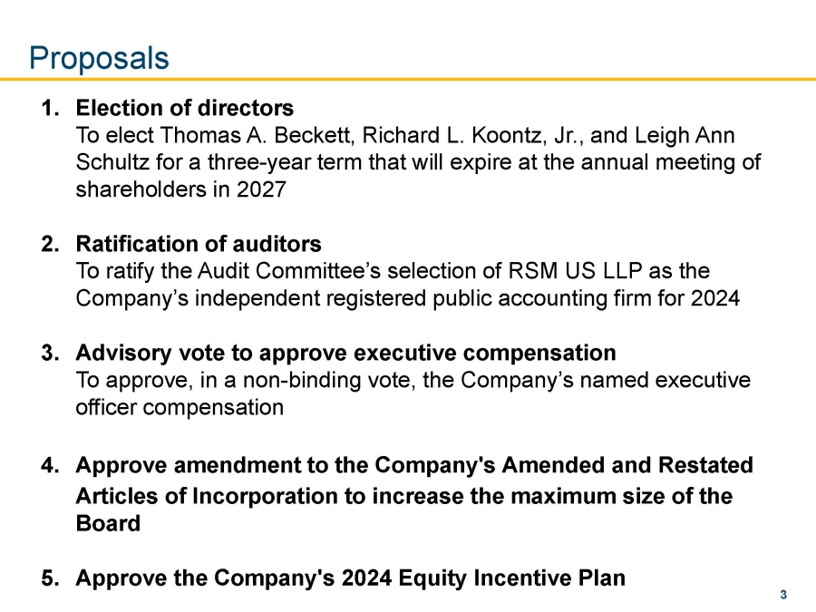 Proposals Election of directors 1. To elect Thomas A. Beckett, Richard L. Koontz, Jr., and Leigh Ann Schultz for a three - year term that will expire at the annual meeting of shareholders in 2027 Ratification of auditors 2. To ratify the Audit Committee’s selection of RSM US LLP as the Company’s independent registered public accounting firm for 2024 Advisory vote to approve executive compensation 3. To approve, in a non - binding vote, the Company’s named executive officer compensation Approve amendment to the Company's Amended and Restated 4. Articles of Incorporation to increase the maximum size of the Board Approve the Company's 2024 Equity Incentive Plan 5. 3