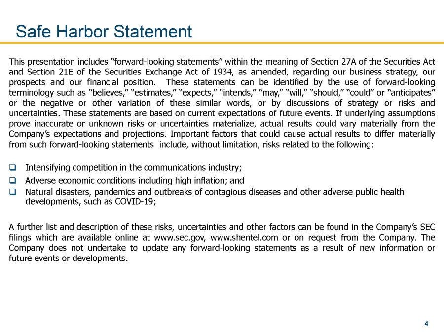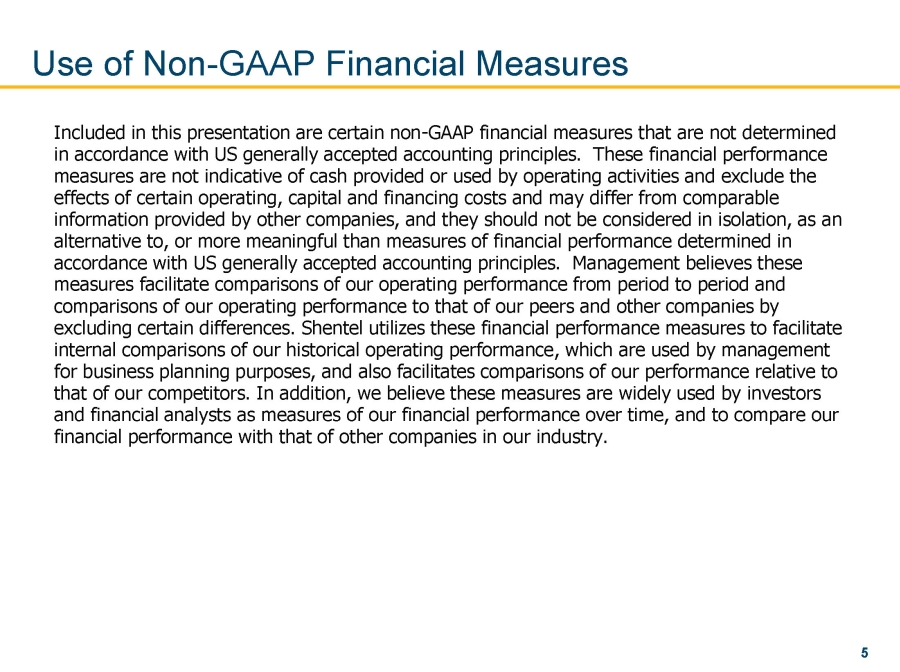 This presentation includes “forward - looking statements” within the meaning of Section 27 A of the Securities Act and Section 21 E of the Securities Exchange Act of 1934 , as amended, regarding our business strategy, our prospects and our financial position . These statements can be identified by the use of forward - looking terminology such as “believes,” “estimates,” “expects,” “intends,” “may,” “will,” “should,” “could” or “anticipates” or the negative or other variation of these similar words, or by discussions of strategy or risks and uncertainties . These statements are based on current expectations of future events . If underlying assumptions prove inaccurate or unknown risks or uncertainties materialize, actual results could vary materially from the Company’s expectations and projections . Important factors that could cause actual results to differ materially from such forward - looking statements include, without limitation, risks related to the following :  Intensifying competition in the communications industry;  Adverse economic conditions including high inflation; and  Natural disasters, pandemics and outbreaks of contagious diseases and other adverse public health developments, such as COVID - 19; A further list and description of these risks, uncertainties and other factors can be found in the Company’s SEC filings which are available online at www . sec . gov, www . shentel . com or on request from the Company . The Company does not undertake to update any forward - looking statements as a result of new information or future events or developments . Safe Harbor Statement 4
