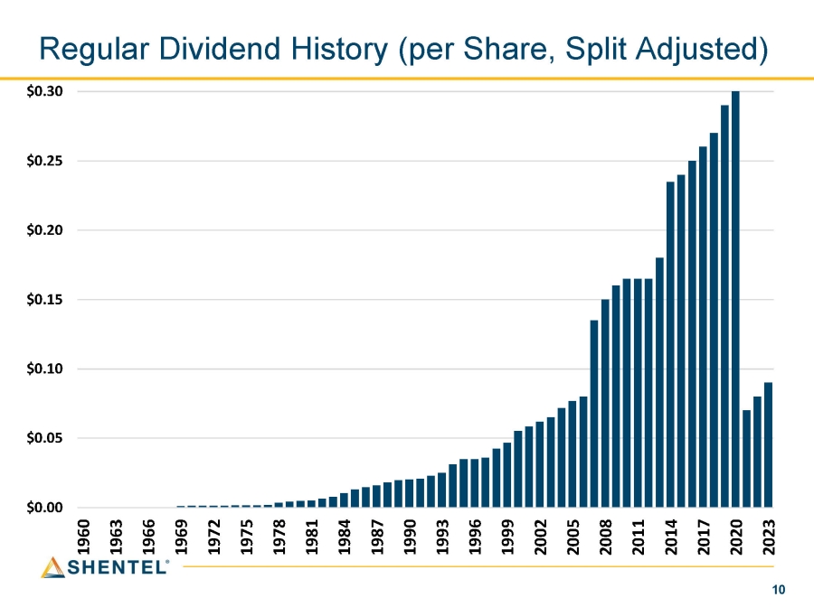 Regular Dividend History (per Share, Split Adjusted) $0.00 10 $0.05 $0.10 $0.15 $0.20 $0.25 $0.30 1960 1963 1966 1969 1972 1975 1978 1981 1984 1987 1990 1993 1996 1999 2002 2005 2008 2011 2014 2017 2020 2023