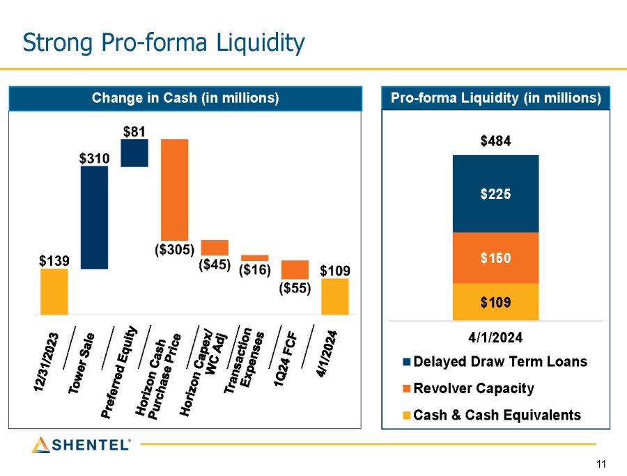 Pro - forma Liquidity (in millions) Strong Pro - forma Liquidity Change in Cash (in millions) $109 $150 $225 $484 4/1/2024 Delayed Draw Term Loans Revolver Capacity Cash & Cash Equivalents 11