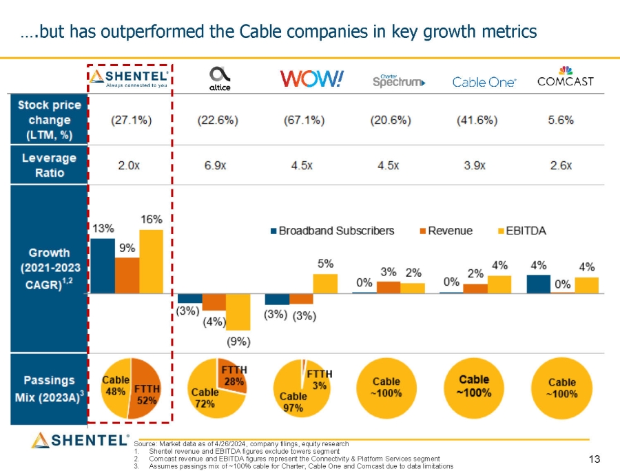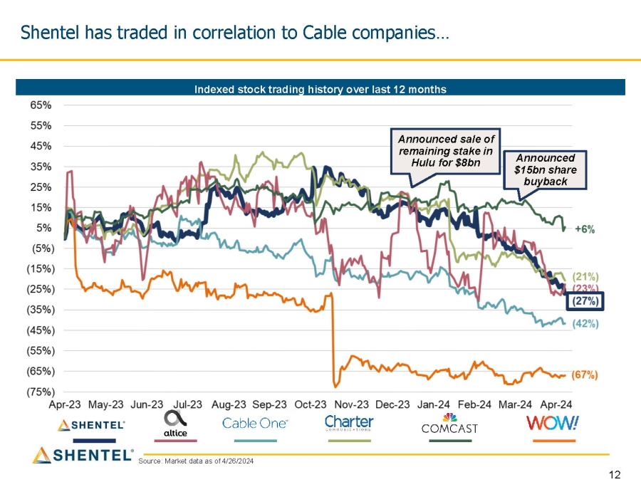 Shentel has traded in correlation to Cable companies… Source: Market data as of 4/26/2024 Indexed stock trading history over last 12 months Announced sale of remaining stake in Hulu for $8bn Announced $15bn share buyback 12