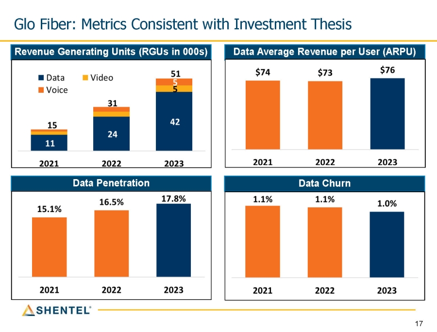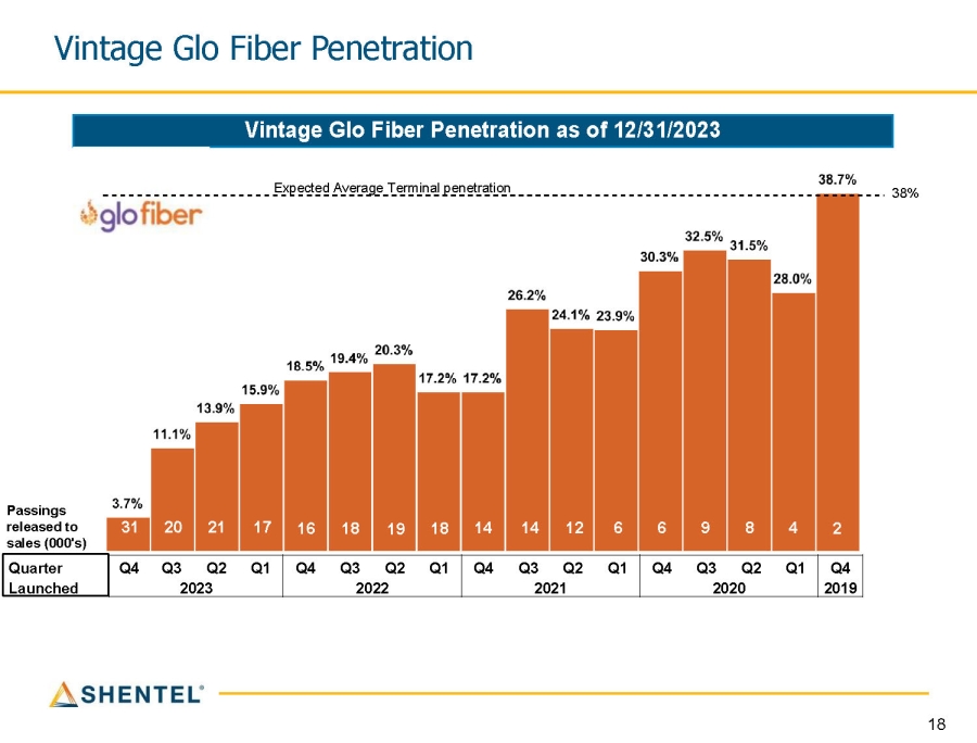 Vintage Glo Fiber Penetration as of 12/31/2023 Vintage Glo Fiber Penetration Quarter Launched 2023 2022 2021 2020 Q4 Q3 Q2 Q1 Q4 Q3 Q2 Q1 Q4 Q3 Q2 Q1 Q4 Q3 Q2 Q1 Q4 2019 Passings released to sales (000's) 16 18 19 18 14 14 12 6 6 9 8 4 2 31 20 21 17 Expected Average Terminal penetration 38% 18