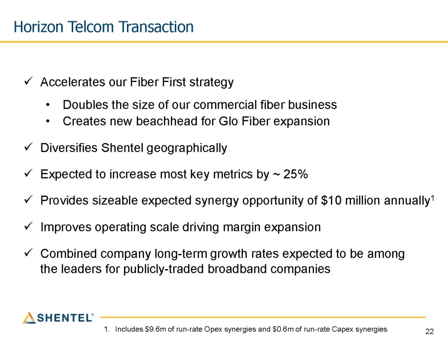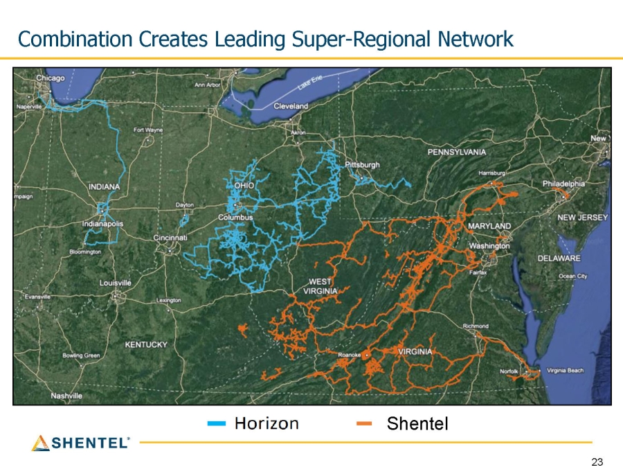 22 Horizon Telcom Transaction x Accelerates our Fiber First strategy • Doubles the size of our commercial fiber business • Creates new beachhead for Glo Fiber expansion x Diversifies Shentel geographically x Expected to increase most key metrics by ~ 25% x Provides sizeable expected synergy opportunity of $10 million annually 1 x Improves operating scale driving margin expansion x Combined company long - term growth rates expected to be among the leaders for publicly - traded broadband companies 1. Includes $9.6m of run - rate Opex synergies and $0.6m of run - rate Capex synergies