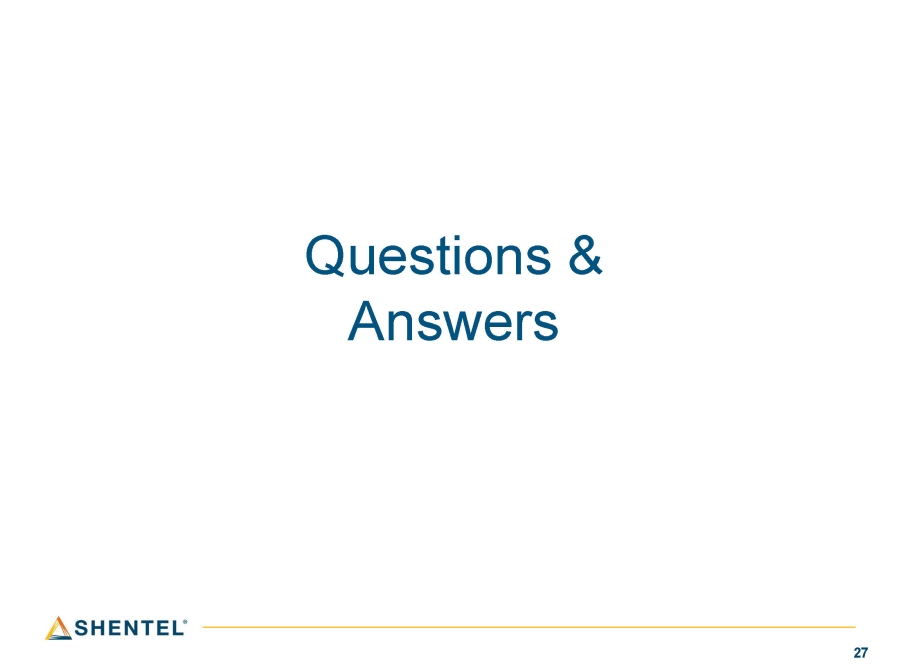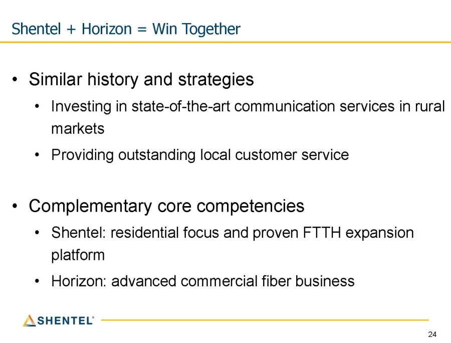 • Similar history and strategies • Investing in state - of - the - art communication services in rural markets • Providing outstanding local customer service • Complementary core competencies • Shentel: residential focus and proven FTTH expansion platform • Horizon: advanced commercial fiber business Shentel + Horizon = Win Together 24