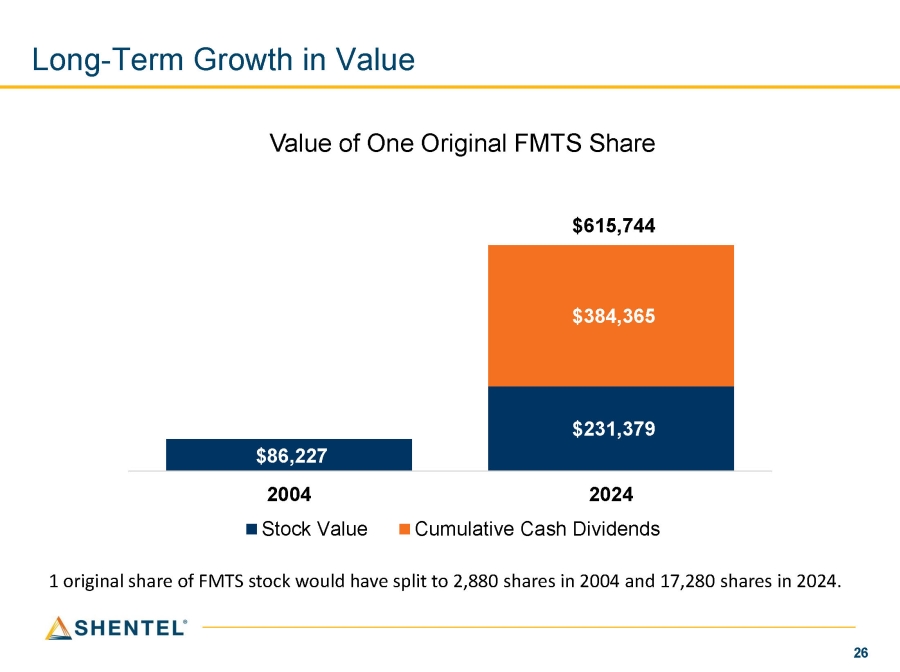 Long - Term Growth in Value 1 original share of FMTS stock would have split to 2,880 shares in 2004 and 17,280 shares in 2024. $86,227 $231,379 $384,365 Value of One Original FMTS Share $615,744 2004 Stock Value 2024 Cumulative Cash Dividends 26
