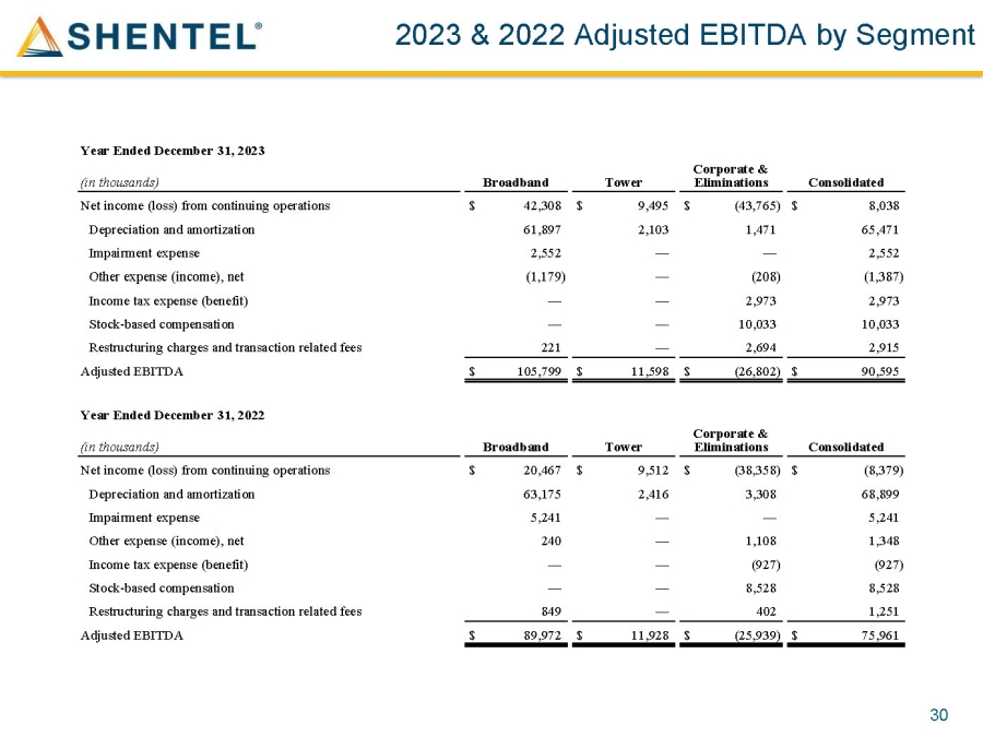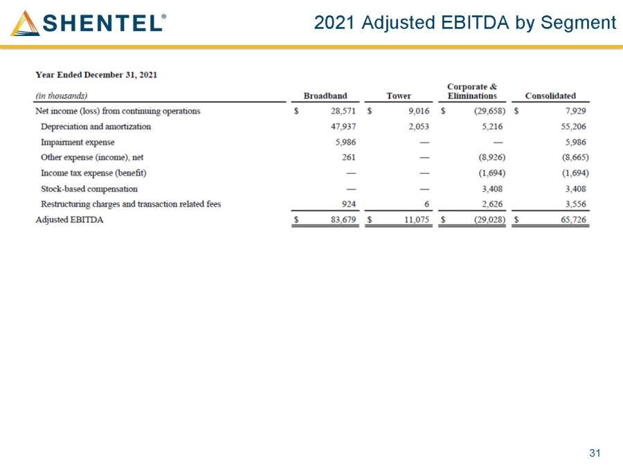2023 & 2022 Adjusted EBITDA by Segment 30 Year Ended December 31, 2023 Consolidated Corporate & Eliminations Tower Broadband (in thousands) $ 8,038 $ (43,765) $ 9,495 $ 42,308 Net income (loss) from continuing operations 65,471 1,471 2,103 61,897 Depreciation and amortization 2,552 — — 2,552 Impairment expense (1,387) (208) — (1,179) Other expense (income), net 2,973 2,973 — — Income tax expense (benefit) 10,033 10,033 — — Stock - based compensation 2,915 2,694 — 221 Restructuring charges and transaction related fees $ 90,595 $ (26,802) $ 11,598 $ 105,799 Adjusted EBITDA Year Ended December 31, 2022 Consolidated Corporate & Eliminations Tower Broadband (in thousands) $ (8,379) $ (38,358) $ 9,512 $ 20,467 Net income (loss) from continuing operations 68,899 3,308 2,416 63,175 Depreciation and amortization 5,241 — — 5,241 Impairment expense 1,348 1,108 — 240 Other expense (income), net (927) (927) — — Income tax expense (benefit) 8,528 8,528 — — Stock - based compensation 1,251 402 — 849 Restructuring charges and transaction related fees $ 75,961 $ (25,939) $ 11,928 $ 89,972 Adjusted EBITDA