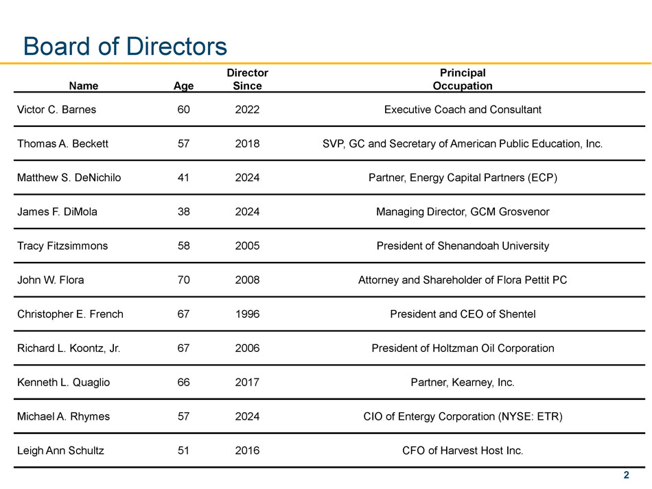 2 Principal Occupation Director Since Age Name Executive Coach and Consultant 2022 60 Victor C. Barnes SVP, GC and Secretary of American Public Education, Inc. 2018 57 Thomas A. Beckett Partner, Energy Capital Partners (ECP) 2024 41 Matthew S. DeNichilo Managing Director, GCM Grosvenor 2024 38 James F. DiMola President of Shenandoah University 2005 58 Tracy Fitzsimmons Attorney and Shareholder of Flora Pettit PC 2008 70 John W. Flora President and CEO of Shentel 1996 67 Christopher E. French President of Holtzman Oil Corporation 2006 67 Richard L. Koontz, Jr. Partner, Kearney, Inc. 2017 66 Kenneth L. Quaglio CIO of Entergy Corporation (NYSE: ETR) 2024 57 Michael A. Rhymes CFO of Harvest Host Inc. 2016 51 Leigh Ann Schultz Board of Directors