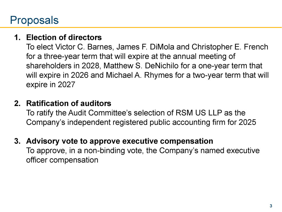 3 Proposals Election of directors 1. To elect Victor C. Barnes, James F. DiMola and Christopher E. French for a three - year term that will expire at the annual meeting of shareholders in 2028, Matthew S. DeNichilo for a one - year term that will expire in 2026 and Michael A. Rhymes for a two - year term that will expire in 2027 Ratification of auditors 2. To ratify the Audit Committee’s selection of RSM US LLP as the Company’s independent registered public accounting firm for 2025 Advisory vote to approve executive compensation 3. To approve, in a non - binding vote, the Company’s named executive officer compensation