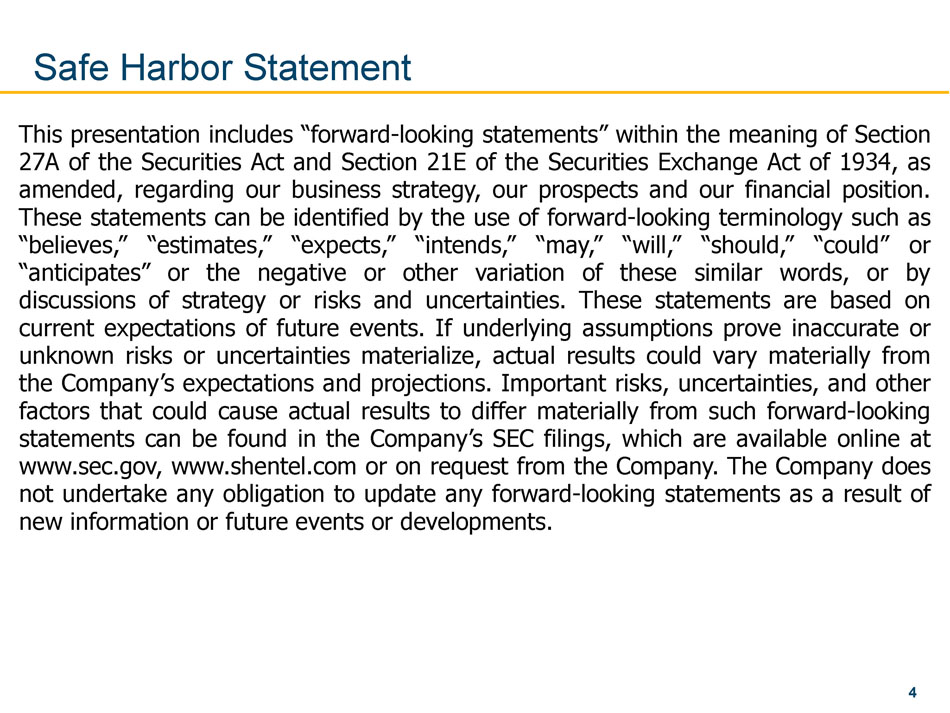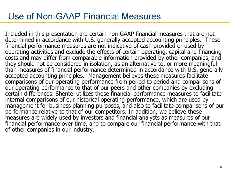 4 This presentation includes “forward - looking statements” within the meaning of Section 27 A of the Securities Act and Section 21 E of the Securities Exchange Act of 1934 , as amended, regarding our business strategy, our prospects and our financial position . These statements can be identified by the use of forward - looking terminology such as “believes,” “estimates,” “expects,” “intends,” “may,” “will,” “should,” “could” or “anticipates” or the negative or other variation of these similar words, or by discussions of strategy or risks and uncertainties . These statements are based on current expectations of future events . If underlying assumptions prove inaccurate or unknown risks or uncertainties materialize, actual results could vary materially from the Company’s expectations and projections . Important risks, uncertainties, and other factors that could cause actual results to differ materially from such forward - looking statements can be found in the Company’s SEC filings, which are available online at www . sec . gov, www . shentel . com or on request from the Company . The Company does not undertake any obligation to update any forward - looking statements as a result of new information or future events or developments . Safe Harbor Statement