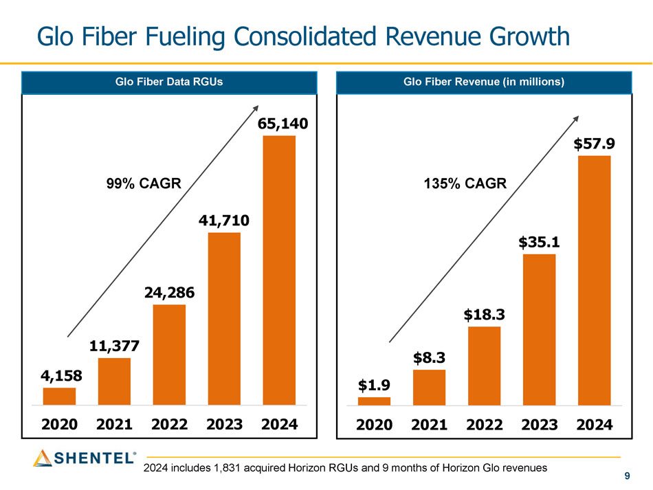 8 Consolidated Highlights - Full Year Results Adjusted EBITDA (in millions) Revenue (in millions) 29.4% margin 28.8% margin 21.9% 19.7% $177.5 $57.9 $67.0 $42.1 $35.1 $176.9 $269.1 $328.1 29.4% margin 28.8% margin $79.0 $94.6 Residential & SMB – Incumbent Broadband Markets Residential & SMB – Glo Fiber Expansion Markets Commercial Fiber RLEC & Other $25.7