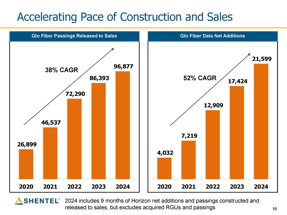 15 211,120 212,050 215,763 239,041 250,000 75,189 147,479 233,872 346,299 550,000 286,309 359,529 449,635 585,340 800,000+ 2021 2022 2023 2024 2026 Projected Incumbent Broadband Markets Glo Fiber Expansion Markets Broadband Network: Rapidly Becoming Fiber - Dominant Broadband Data Homes and Businesses Passed