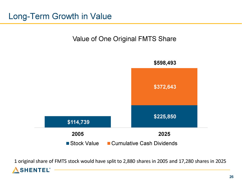 1 original share of FMTS stock would have split to 2,880 shares in 2005 and 17,280 shares in 2025 26 Long - Term Growth in Value $114,739 $225,850 $372,643 $598,493 2005 Stock Value 2025 Cumulative Cash Dividends Value of One Original FMTS Share