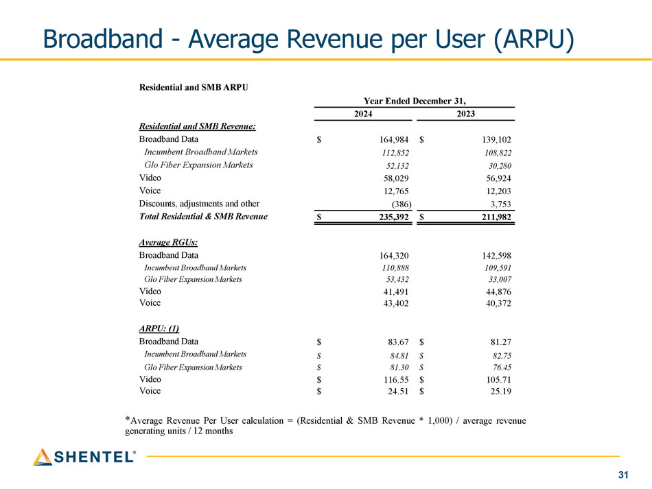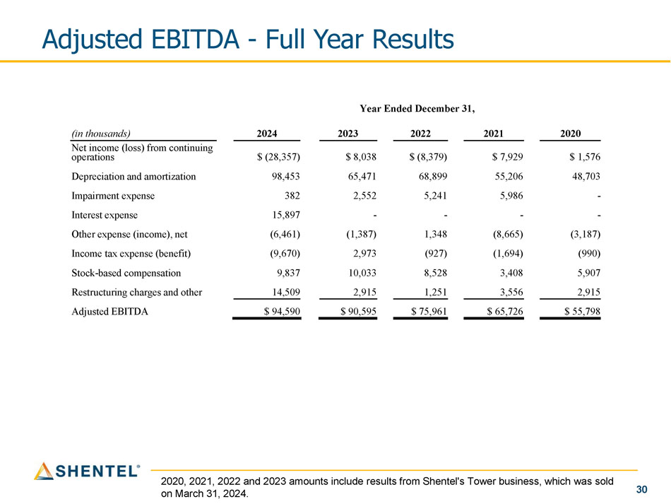 30 2020 Year Ended December 31, (in thousands) 2021 2022 2023 2024 $ 1,576 $ 7,929 $ (8,379) $ 8,038 $ (28,357) Net income (loss) from continuing operations 48,703 55,206 68,899 65,471 98,453 Depreciation and amortization - 5,986 5,241 2,552 382 Impairment expense - - - - 15,897 Interest expense (3,187) (8,665) 1,348 (1,387) (6,461) Other expense (income), net (990) (1,694) (927) 2,973 (9,670) Income tax expense (benefit) 5,907 3,408 8,528 10,033 9,837 Stock - based compensation 2,915 3,556 1,251 2,915 14,509 Restructuring charges and other $ 55,798 $ 65,726 $ 75,961 $ 90,595 $ 94,590 Adjusted EBITDA Adjusted EBITDA - Full Year Results 2020, 2021, 2022 and 2023 amounts include results from Shentel's Tower business, which was sold on March 31, 2024.
