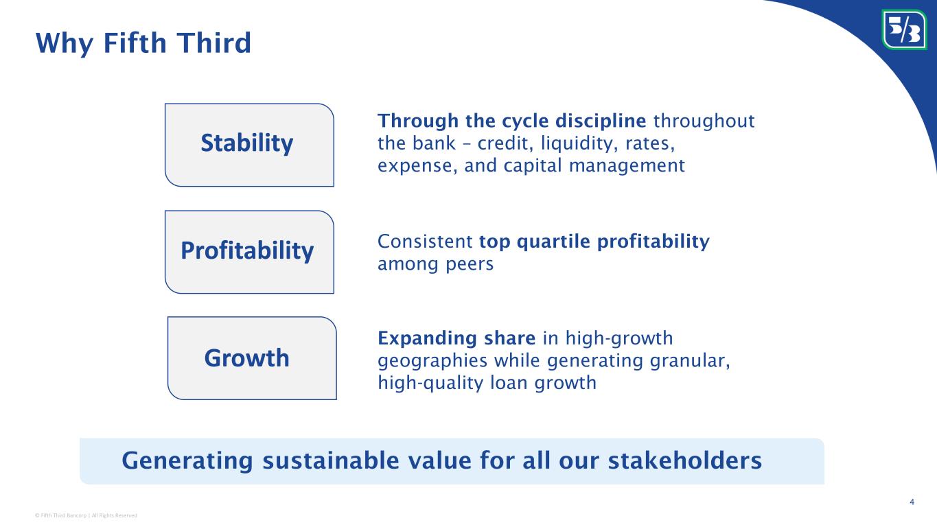 © Fifth Third Bancorp | All Rights Reserved 3 Our purpose, vision, and core values support our commitment to generating sustainable value for stakeholders Our Vision Be the One Bank people most value and trust Our Core Values Our Purpose To improve the lives of our customers and the well-being of our communities Work as One Bank Take Accountability Be Respectful Act with Integrity Living our purpose guided by our vision and values