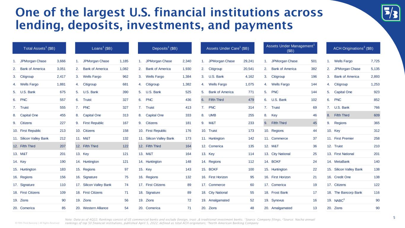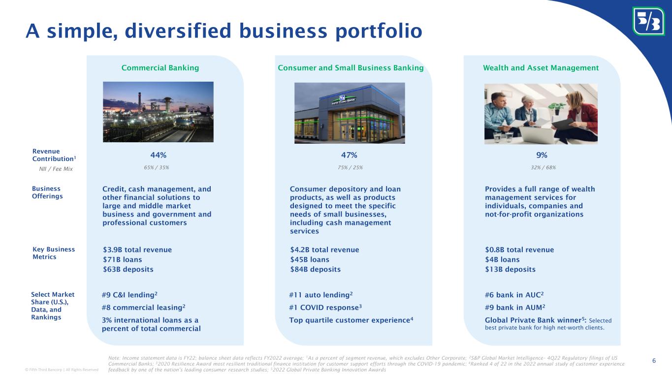 © Fifth Third Bancorp | All Rights Reserved One of the largest U.S. financial institutions across lending, deposits, investments, and payments Note: Data as of 4Q22; Rankings consist of US commercial banks and exclude foreign, trust ,& traditional investment banks. 1 Source: Company filings, 2 Source: Nacha annual rankings of top 50 financial institutions, published April 5, 2022; defined as total ACH originators; 3 North American Banking Company 5 1. JPMorgan Chase 3,666 1. JPMorgan Chase 1,185 1. JPMorgan Chase 2,340 1. JPMorgan Chase 29,241 1. JPMorgan Chase 501 1. Wells Fargo 7,725 2. Bank of America 3,051 2. Bank of America 1,082 2. Bank of America 1,930 2. Citigroup 20,541 2. Bank of America 382 2. JPMorgan Chase 5,135 3. Citigroup 2,417 3. Wells Fargo 962 3. Wells Fargo 1,384 3. U.S. Bank 4,162 3. Citigroup 196 3. Bank of America 2,893 4. Wells Fargo 1,881 4. Citigroup 681 4. Citigroup 1,382 4. Wells Fargo 1,075 4. Wells Fargo 144 4. Citigroup 1,253 5. U.S. Bank 675 5. U.S. Bank 390 5. U.S. Bank 525 5. Bank of America 771 5. PNC 144 5. Capital One 923 6. PNC 557 6. Truist 327 6. PNC 436 6. Fifth Third 479 6. U.S. Bank 102 6. PNC 852 7. Truist 555 7. PNC 327 7. Truist 413 7. PNC 314 7. Truist 69 7. U.S. Bank 766 8. Capital One 455 8. Capital One 313 8. Capital One 333 8. UMB 255 8. Key 46 8. Fifth Third 609 9. Citizens 227 9. First Republic 167 9. Citizens 181 9. M&T 233 9. Fifth Third 45 9. Regions 365 10. First Republic 213 10. Citizens 158 10. First Republic 176 10. Truist 173 10. Regions 44 10. Key 312 11. Silicon Valley Bank 212 11. M&T 132 11. Silicon Valley Bank 173 11. Huntington 142 11. Commerce 37 11. First Premier 258 12. Fifth Third 207 12. Fifth Third 122 12. Fifth Third 164 12. Comerica 135 12. M&T 36 12. Truist 210 13. M&T 201 13. Key 121 13. M&T 164 13. Key 114 13. City National 25 13. First National 201 14. Key 190 14. Huntington 121 14. Huntington 148 14. Regions 112 14. BOKF 24 14. MetaBank 140 15. Huntington 183 15. Regions 97 15. Key 143 15. BOKF 100 15. Huntington 22 15. Silicon Valley Bank 138 16. Regions 156 16. Signature 75 16. Regions 132 16. First Horizon 95 16. First Horizon 21 16. Credit One 138 17. Signature 110 17. Silicon Valley Bank 74 17. First Citizens 89 17. Commerce 60 17. Comerica 19 17. Citizens 122 18. First Citizens 109 18. First Citizens 71 18. Signature 89 18. City National 55 18. Frost Bank 17 18. The Bancorp Bank 116 19. Zions 90 19. Zions 56 19. Zions 72 19. Amalgamated 52 19. Synovus 16 19. NABC 3 90 20. Comerica 85 20. Western Alliance 54 20. Comerica 71 20. Zions 48 20. Amalgamated 13 20. Zions 90 ACH Originations 2 ($B)Total Assets 1 ($B) Loans 1 ($B) Deposits 1 ($B) Assets Under Care 1 ($B) Assets Under Management 1 ($B)