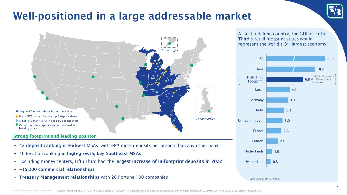 © Fifth Third Bancorp | All Rights Reserved Commercial Banking 44% Credit, cash management, and other financial solutions to large and middle market business and government and professional customers $3.9B total revenue $71B loans $63B deposits Consumer and Small Business Banking Wealth and Asset Management Revenue Contribution 1 Business Offerings 47% 9% Key Business Metrics Provides a full range of wealth management services for individuals, companies and not-for-profit organizations $0.8B total revenue $4B loans $13B deposits Consumer depository and loan products, as well as products designed to meet the specific needs of small businesses, including cash management services $4.2B total revenue $45B loans $84B deposits Note: Income statement data is FY22; balance sheet data reflects FY2022 average; 1 As a percent of segment revenue, which excludes Other Corporate; 2 S&P Global Market Intelligence– 4Q22 Regulatory filings of US Commercial Banks; 3 2020 Resilience Award most resilient traditional finance institution for customer support efforts through the COVID-19 pandemic; 4 Ranked 4 of 22 in the 2022 annual study of customer experience feedback by one of the nation’s leading consumer research studies; 5 2022 Global Private Banking Innovation Awards Select Market Share (U.S.), Data, and Rankings #9 C&I lending 2 #8 commercial leasing 2 3% international loans as a percent of total commercial #11 auto lending 2 #1 COVID response 3 Top quartile customer experience 4 #6 bank in AUC 2 #9 bank in AUM 2 Global Private Bank winner 5 : Selected best private bank for high net-worth clients. NII / Fee Mix 65% / 35% 75% / 25% 32% / 68% A simple, diversified business portfolio 6