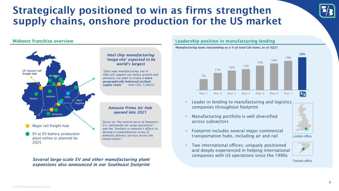 © Fifth Third Bancorp | All Rights Reserved Regional footprint 1 (branch count in white) Out of footprint corporate and middle market banking office Major FITB markets 2 with a top 5 deposit share • #2 deposit ranking in Midwest MSAs, with ~8% more deposits per branch than any other bank • #6 location ranking in high-growth, key Southeast MSAs • Excluding money centers, Fifth Third had the largest increase of in-footprint deposits in 2022 • ~15,000 commercial relationships • Treasury Management relationships with 26 Fortune 100 companies Strong footprint and leading position London office As a standalone country, the GDP of Fifth Third’s retail footprint states would represent the world’s 3 rd largest economy 0.8 1.0 2.1 2.8 3.0 3.3 4.1 4.3 6.8 18.2 25.5 Switzerland Netherlands Canada France United Kingdom India Germany Japan Fifth Third Footprint China USA 2022 nominal GDP ($ trillions)3 Major FITB markets 2 with a top 10 deposit share Toronto office 269 169 103 159 72 5 41 76 4 30 161 Well-positioned in a large addressable market ~50% split between the Midwest and Southeast 1 Branch count as of 1/31/23; 2 Includes MSAs with $5BN+ in deposits on a capped basis (deposits per branch capped at $250MM per June 2022 FDIC data); 3 Source: BEA 7