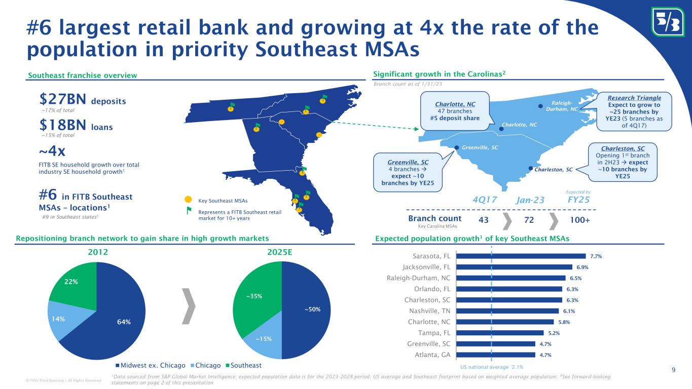 © Fifth Third Bancorp | All Rights Reserved #6 largest retail bank and growing at 4x the rate of the population in priority Southeast MSAs Charleston, SC Opening 1 st branch in 2H23 → expect ~10 branches by YE25 64% 14% 22% Midwest ex. Chicago Chicago Southeast 9 Key Southeast MSAs Represents a FITB Southeast retail market for 10+ years Repositioning branch network to gain share in high growth markets Southeast franchise overview 4.7% 4.7% 5.2% 5.8% 6.1% 6.3% 6.3% 6.5% 6.9% 7.7% Atlanta, GA Greenville, SC Tampa, FL Charlotte, NC Nashville, TN Charleston, SC Orlando, FL Raleigh-Durham, NC Jacksonville, FL Sarasota, FL Expected population growth 1 of key Southeast MSAs US national average 2.1% Significant growth in the Carolinas 2 Raleigh- Durham, NC Charleston, SC Greenville, SC Charlotte, NC FY254Q17 100+ Expected by Branch count Jan-23 ~50% ~15% ~35% 2012 2025E $27BN deposits $18BN loans ~4x FITB SE household growth over total industry SE household growth 1 #6 in FITB Southeast MSAs – locations 1 #9 in Southeast states 1 Key Carolina MSAs 43 72 Greenville, SC 4 branches → expect ~10 branches by YE25 Research Triangle Expect to grow to ~25 branches by YE23 (5 branches as of 4Q17) Charlotte, NC 47 branches #5 deposit share 1 Data sourced from S&P Global Market Intelligence; expected population data is for the 2023-2028 period; US average and Southeast footprint based on weighted average population; 3 See forward-looking statements on page 2 of this presentation Branch count as of 1/31/23 ~17% of total ~15% of total
