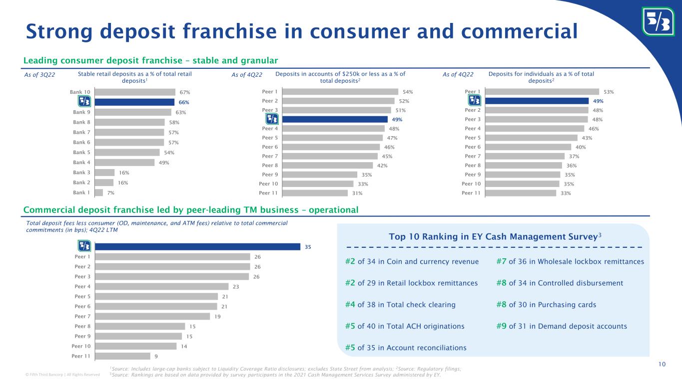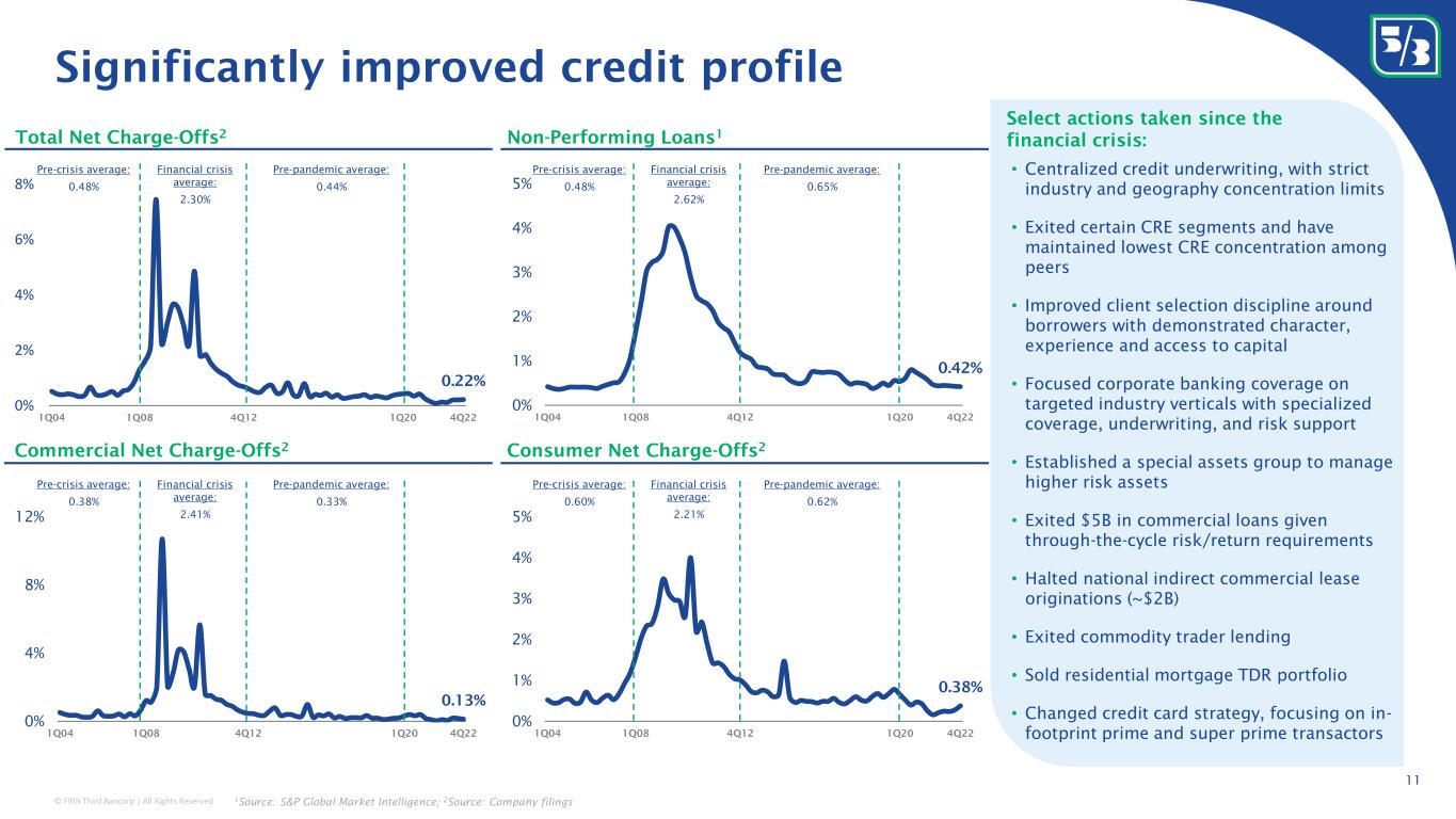 © Fifth Third Bancorp | All Rights Reserved Strong deposit franchise in consumer and commercial 10 Leading consumer deposit franchise – stable and granular 33% 35% 35% 36% 37% 40% 43% 46% 48% 48% 49% 53% Peer 11 Peer 10 Peer 9 Peer 8 Peer 7 Peer 6 Peer 5 Peer 4 Peer 3 Peer 2 x Peer 1 Deposits for individuals as a % of total deposits 2 31% 33% 35% 42% 45% 46% 47% 48% 49% 51% 52% 54% Peer 11 Peer 10 Peer 9 Peer 8 Peer 7 Peer 6 Peer 5 Peer 4 x Peer 3 Peer 2 Peer 1 Deposits in accounts of $250k or less as a % of total deposits 2 7% 16% 16% 49% 54% 57% 57% 58% 63% 66% 67% Bank 1 Bank 2 Bank 3 Bank 4 Bank 5 Bank 6 Bank 7 Bank 8 Bank 9 X Bank 10 Stable retail deposits as a % of total retail deposits 1 Commercial deposit franchise led by peer-leading TM business – operational #2 of 34 in Coin and currency revenue #2 of 29 in Retail lockbox remittances #4 of 38 in Total check clearing #5 of 40 in Total ACH originations #5 of 35 in Account reconciliations 9 14 15 15 19 21 21 23 26 26 26 35 Peer 11 Peer 10 Peer 9 Peer 8 Peer 7 Peer 6 Peer 5 Peer 4 Peer 3 Peer 2 Peer 1 x Total deposit fees less consumer (OD, maintenance, and ATM fees) relative to total commercial commitments (in bps); 4Q22 LTM Top 10 Ranking in EY Cash Management Survey 3 #7 of 36 in Wholesale lockbox remittances #8 of 34 in Controlled disbursement #8 of 30 in Purchasing cards #9 of 31 in Demand deposit accounts 1 Source: Includes large-cap banks subject to Liquidity Coverage Ratio disclosures; excludes State Street from analysis; 2 Source: Regulatory filings; 3 Source: Rankings are based on data provided by survey participants in the 2021 Cash Management Services Survey administered by EY. As of 3Q22 As of 4Q22 As of 4Q22