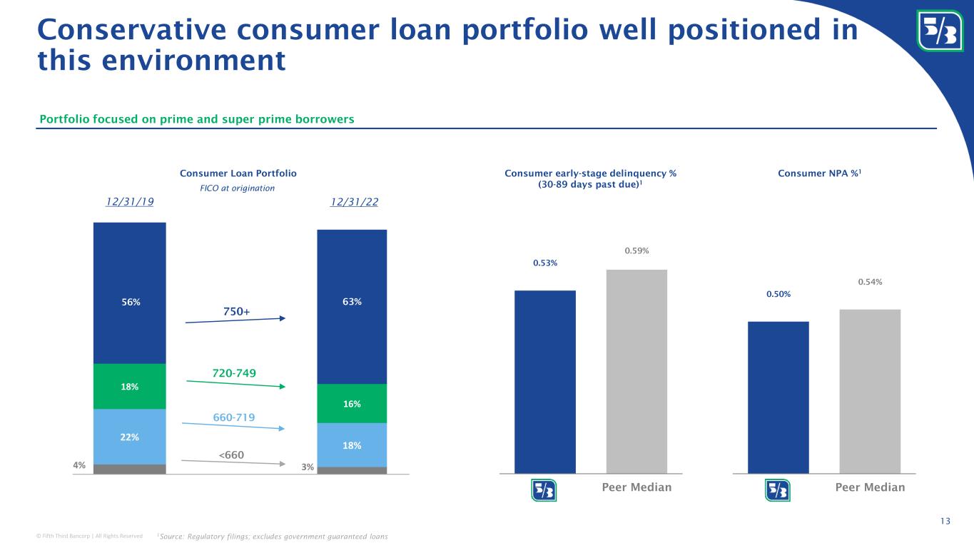 © Fifth Third Bancorp | All Rights Reserved 12 Well diversified commercial portfolio favoring large borrowers with a track record of resilience 15% 14% 13% 8%7% 7% 6% 6% 5% 4% 4% 11% Real Estate Manufacturing Fin Services & Ins Business Services Health Care Wholesale Trade Retail Trade Accommodation & Food Mining Communication & Information Construction Other Commercial portfolio balances by NAICS code $76B Proactive monitoring of credit risk exposure • Utilizing multi-factor client specific early warning systems for both public and private companies to create a composite score. Factors include: • Real-time liquidity metrics (monitoring of unexpected revolver utilization and unexpected overdraft occurrences) • Covenant monitoring and third-party portfolio insights, which includes a forward-looking view of vulnerabilities based on firm specific and industry trends • Well-diversified by property type with lower exposures to hospitality and retail • Non-owner occupied CRE office (~$1.6BN) is primarily concentrated in Class A trophy properties • Lowest concentration of CRE as a percentage of total risk-based capital relative to peers Prudent credit risk management across all portfolios Portfolios of interest Deliberately positioned the commercial portfolio to be resilient through the cycle 1 Source: Loan Stats Weekly from Pitchbook Commercial Real Estate • Highly monitored leveraged lending portfolio balances sub-$3BN has decreased ~65% since 1Q16 while total commercial loans have increased ~35% • Represents ~2% of total loans in 4Q22 vs. ~8% in 2015 • <25% of exposures are cov-lite vs. ~90% market average 1 • ~40% of ~$37BN SNC balances are investment grade equivalent borrowers; independently underwrite each transaction • Lead left / lead right on ~40% of relationships Leveraged Lending Shared National Credits (SNC)