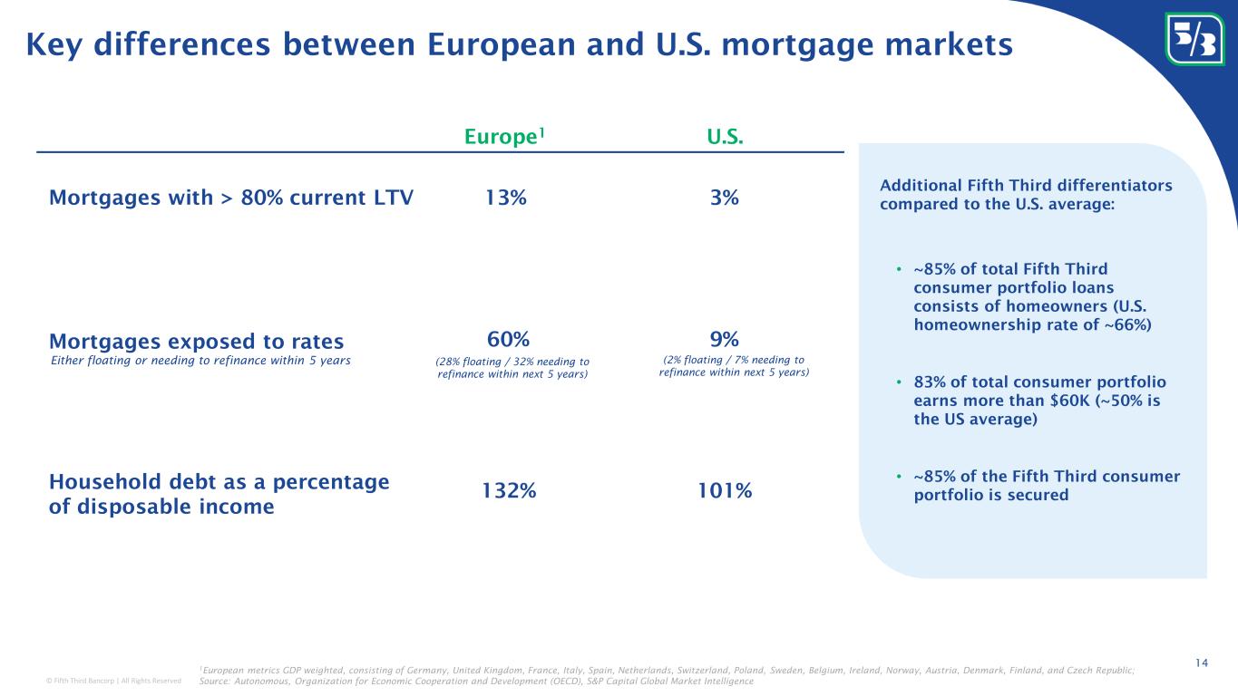 © Fifth Third Bancorp | All Rights Reserved 56% 18% 22% 4% 63% 16% 18% 3% 12/31/19 13 Portfolio focused on prime and super prime borrowers 12/31/22 Consumer Loan Portfolio FICO at origination Consumer NPA % 1 0.50% 0.54% X Peer Median 0.53% 0.59% X Peer Median Consumer early-stage delinquency % (30-89 days past due) 1 Conservative consumer loan portfolio well positioned in this environment 750+ 720-749 <660 660-719 1 Source: Regulatory filings; excludes government guaranteed loans