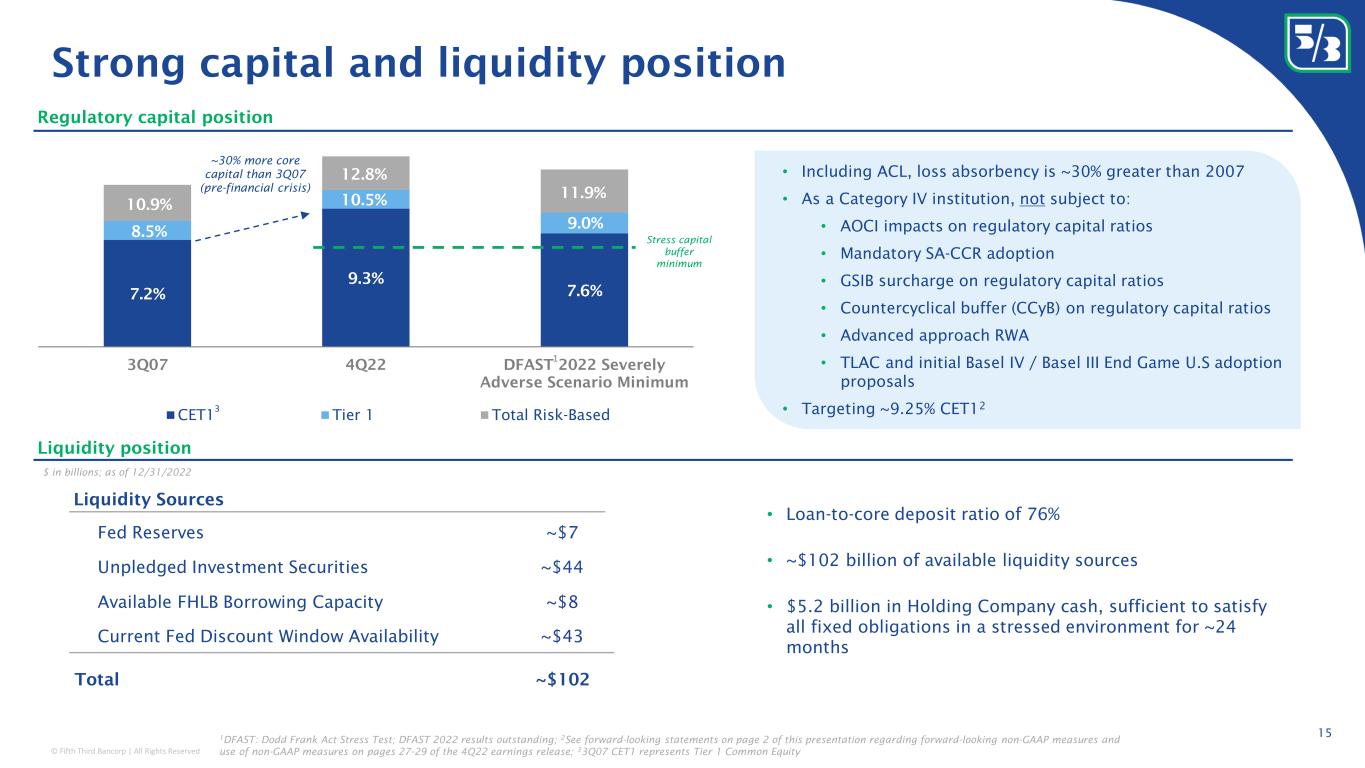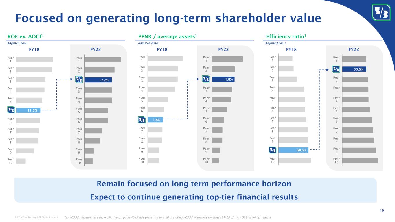 © Fifth Third Bancorp | All Rights Reserved 7.2% 9.3% 7.6% 3Q07 4Q22 DFAST 2022 Severely Adverse Scenario Minimum CET1 Tier 1 Total Risk-Based Strong capital and liquidity position 10.5% • Loan-to-core deposit ratio of 76% • ~$102 billion of available liquidity sources • $5.2 billion in Holding Company cash, sufficient to satisfy all fixed obligations in a stressed environment for ~24 months Regulatory capital position Fed Reserves Unpledged Investment Securities Available FHLB Borrowing Capacity Current Fed Discount Window Availability Total ~$7 ~$44 ~$8 ~$43 ~$102 Liquidity Sources Liquidity position $ in billions; as of 12/31/2022 • Including ACL, loss absorbency is ~30% greater than 2007 • As a Category IV institution, not subject to: • AOCI impacts on regulatory capital ratios • Mandatory SA-CCR adoption • GSIB surcharge on regulatory capital ratios • Countercyclical buffer (CCyB) on regulatory capital ratios • Advanced approach RWA • TLAC and initial Basel IV / Basel III End Game U.S adoption proposals • Targeting ~9.25% CET1 2 12.8% 8.5% 10.9% 9.0% 11.9% 1 ~30% more core capital than 3Q07 (pre-financial crisis) 3 Stress capital buffer minimum 15 1 DFAST: Dodd Frank Act Stress Test; DFAST 2022 results outstanding; 2 See forward-looking statements on page 2 of this presentation regarding forward-looking non-GAAP measures and use of non-GAAP measures on pages 27-29 of the 4Q22 earnings release; 3 3Q07 CET1 represents Tier 1 Common Equity