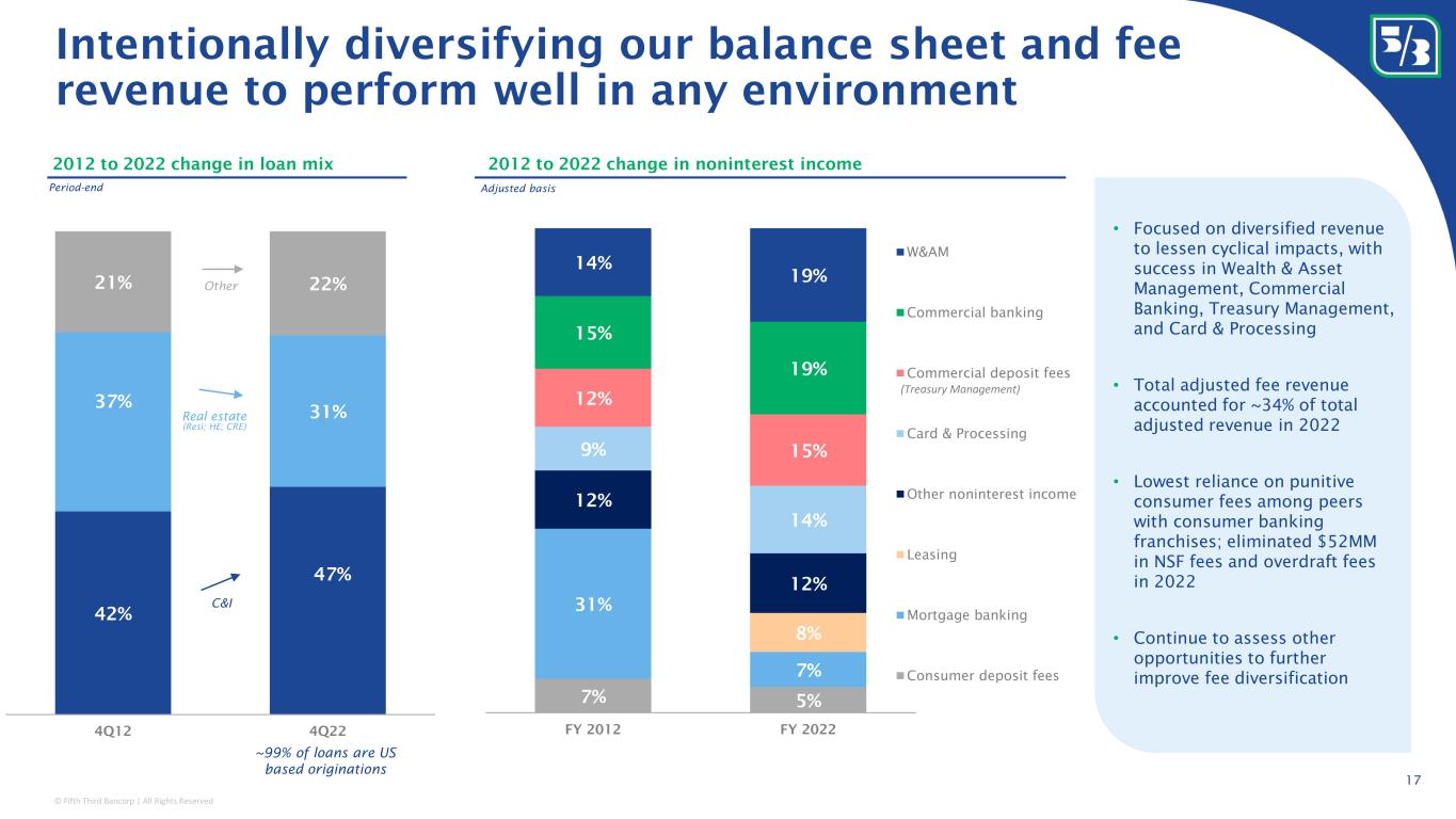 © Fifth Third Bancorp | All Rights Reserved 12.2% Peer 10 Peer 9 Peer 8 Peer 7 Peer 6 Peer 5 Peer 4 Peer 3 x Peer 2 Peer 1 Focused on generating long-term shareholder value 60.5% Peer 10 x Peer 9 Peer 8 Peer 7 Peer 6 Peer 5 Peer 4 Peer 3 Peer 2 Peer 1 11.7% Peer 10 Peer 9 Peer 8 Peer 7 Peer 6 X Peer 5 Peer 4 Peer 3 Peer 2 Peer 1 1.8% Peer 10 Peer 9 Peer 8 Peer 7 x Peer 6 Peer 5 Peer 4 Peer 3 Peer 2 Peer 1 1.8% Peer 10 Peer 9 Peer 8 Peer 7 Peer 6 Peer 5 Peer 4 Peer 3 x Peer 2 Peer 1 55.6% Peer 10 Peer 9 Peer 8 Peer 7 Peer 6 Peer 5 Peer 4 Peer 3 Peer 2 x Peer 1 16 ROE ex. AOCI 1 FY18 FY22 FY18 FY22 FY18 FY22 PPNR / average assets 1 Efficiency ratio 1 Adjusted basis Adjusted basis Adjusted basis Remain focused on long-term performance horizon Expect to continue generating top-tier financial results 1 Non-GAAP measure: see reconciliation on page 40 of this presentation and use of non-GAAP measures on pages 27-29 of the 4Q22 earnings release