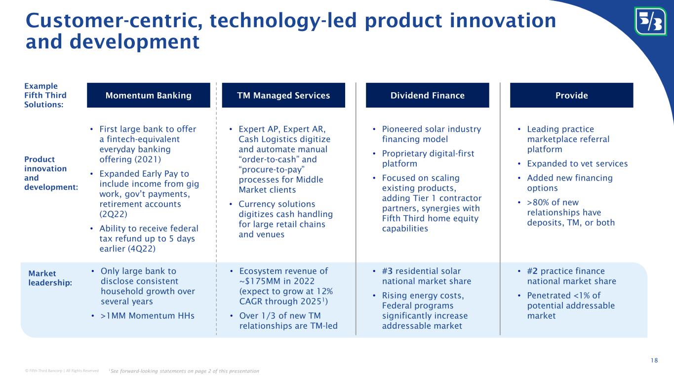 © Fifth Third Bancorp | All Rights Reserved 7% 5% 31% 7% 8% 12% 12% 9% 14% 12% 15% 15% 19% 14% 19% FY 2012 FY 2022 W&AM Commercial banking Commercial deposit fees Card & Processing Other noninterest income Leasing Mortgage banking Consumer deposit fees 42% 47% 37% 31% 21% 22% 4Q12 4Q22 C&I Real estate (Resi; HE; CRE) Other Intentionally diversifying our balance sheet and fee revenue to perform well in any environment • Focused on diversified revenue to lessen cyclical impacts, with success in Wealth & Asset Management, Commercial Banking, Treasury Management, and Card & Processing • Total adjusted fee revenue accounted for ~34% of total adjusted revenue in 2022 • Lowest reliance on punitive consumer fees among peers with consumer banking franchises; eliminated $52MM in NSF fees and overdraft fees in 2022 • Continue to assess other opportunities to further improve fee diversification (Treasury Management) 2012 to 2022 change in loan mix 2012 to 2022 change in noninterest income Adjusted basisPeriod-end ~99% of loans are US based originations 17