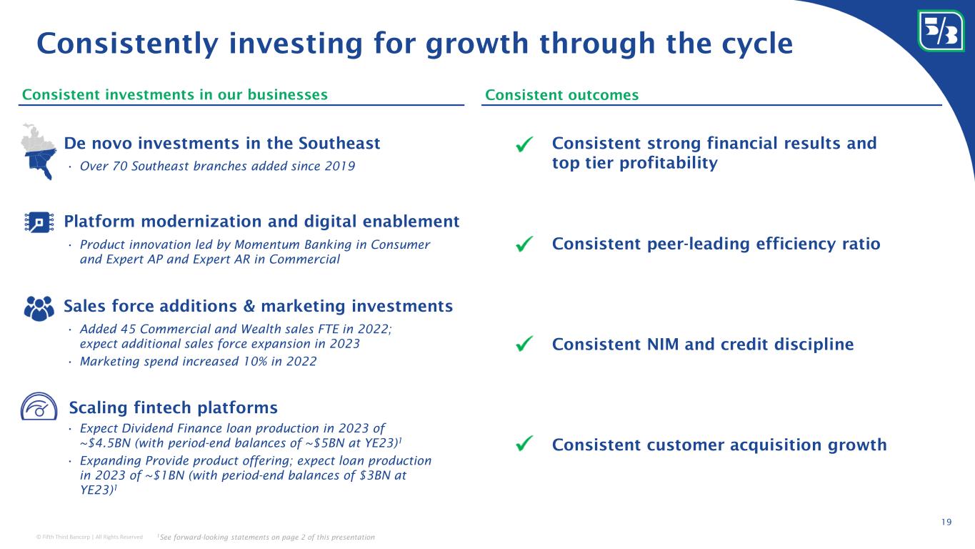 © Fifth Third Bancorp | All Rights Reserved 18 Example Fifth Third Solutions: Product innovation and development: Market leadership: • #3 residential solar national market share • Rising energy costs, Federal programs significantly increase addressable market • #2 practice finance national market share • Penetrated <1% of potential addressable market • Ecosystem revenue of ~$175MM in 2022 (expect to grow at 12% CAGR through 2025 1 ) • Over 1/3 of new TM relationships are TM-led • Only large bank to disclose consistent household growth over several years • >1MM Momentum HHs Momentum Banking Dividend Finance ProvideTM Managed Services • Pioneered solar industry financing model • Proprietary digital-first platform • Focused on scaling existing products, adding Tier 1 contractor partners, synergies with Fifth Third home equity capabilities • Leading practice marketplace referral platform • Expanded to vet services • Added new financing options • >80% of new relationships have deposits, TM, or both Customer-centric, technology-led product innovation and development 1 See forward-looking statements on page 2 of this presentation • First large bank to offer a fintech-equivalent everyday banking offering (2021) • Expanded Early Pay to include income from gig work, gov’t payments, retirement accounts (2Q22) • Ability to receive federal tax refund up to 5 days earlier (4Q22) • Expert AP, Expert AR, Cash Logistics digitize and automate manual “order-to-cash” and “procure-to-pay” processes for Middle Market clients • Currency solutions digitizes cash handling for large retail chains and venues