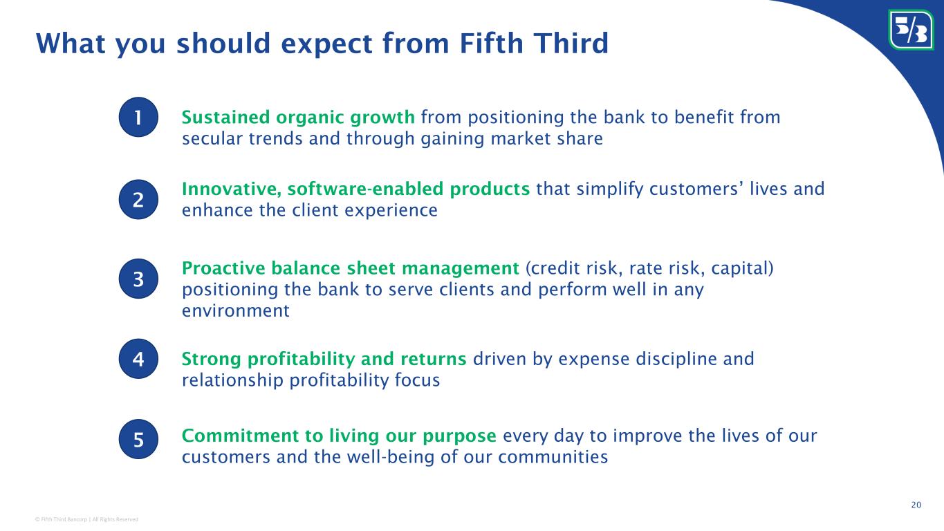 © Fifth Third Bancorp | All Rights Reserved 19 1 See forward-looking statements on page 2 of this presentation Consistently investing for growth through the cycle Consistent strong financial results and top tier profitability Consistent NIM and credit discipline Consistent customer acquisition growth Consistent peer-leading efficiency ratio De novo investments in the Southeast Sales force additions & marketing investments Scaling fintech platforms Platform modernization and digital enablement Consistent outcomesConsistent investments in our businesses • Over 70 Southeast branches added since 2019 • Product innovation led by Momentum Banking in Consumer and Expert AP and Expert AR in Commercial • Added 45 Commercial and Wealth sales FTE in 2022; expect additional sales force expansion in 2023 • Marketing spend increased 10% in 2022 • Expect Dividend Finance loan production in 2023 of ~$4.5BN (with period-end balances of ~$5BN at YE23) 1 • Expanding Provide product offering; expect loan production in 2023 of ~$1BN (with period-end balances of $3BN at YE23) 1
