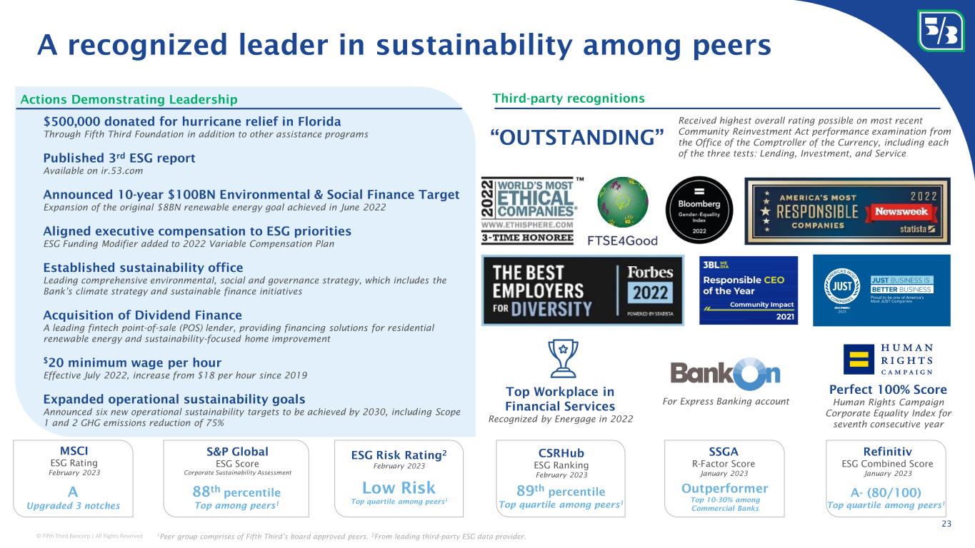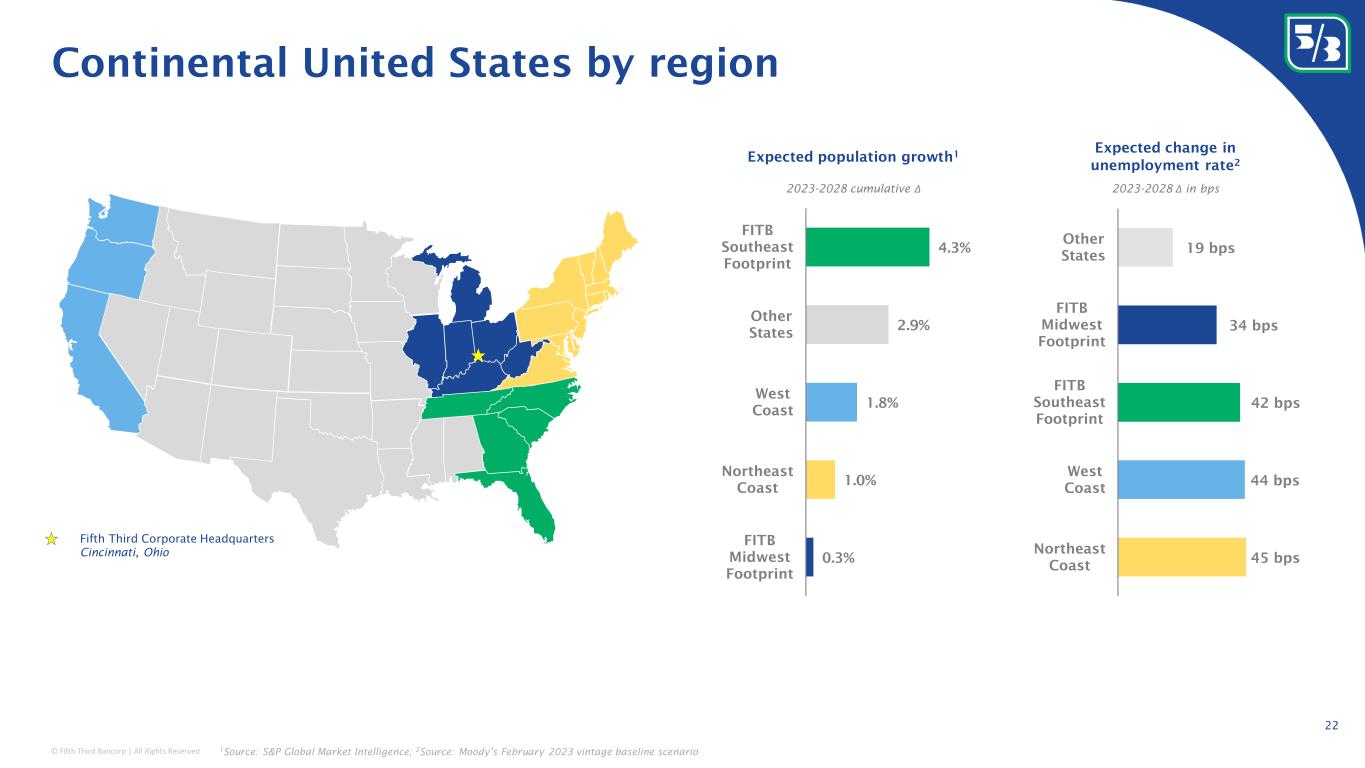 © Fifth Third Bancorp | All Rights Reserved Continental United States by region 1 Source: S&P Global Market Intelligence; 2 Source: Moody’s February 2023 vintage baseline scenario Fifth Third Corporate Headquarters Cincinnati, Ohio 45 bps 44 bps 42 bps 34 bps 19 bps Northeast Coast West Coast FITB Southeast Footprint FITB Midwest Footprint Other States Expected change in unemployment rate 2 0.3% 1.0% 1.8% 2.9% 4.3% FITB Midwest Footprint Northeast Coast West Coast Other States FITB Southeast Footprint Expected population growth 1 2023-2028 Δ in bps2023-2028 cumulative Δ 22