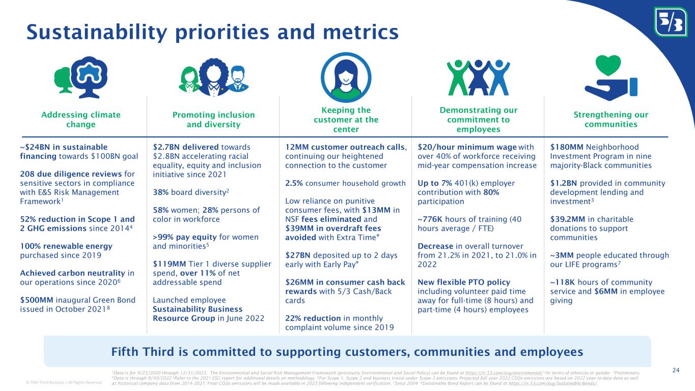 © Fifth Third Bancorp | All Rights Reserved 23 Actions Demonstrating Leadership Third-party recognitions $500,000 donated for hurricane relief in Florida Through Fifth Third Foundation in addition to other assistance programs Published 3 rd ESG report Available on ir.53.com Announced 10-year $100BN Environmental & Social Finance Target Expansion of the original $8BN renewable energy goal achieved in June 2022 Aligned executive compensation to ESG priorities ESG Funding Modifier added to 2022 Variable Compensation Plan Established sustainability office Leading comprehensive environmental, social and governance strategy, which includes the Bank’s climate strategy and sustainable finance initiatives Acquisition of Dividend Finance A leading fintech point-of-sale (POS) lender, providing financing solutions for residential renewable energy and sustainability-focused home improvement $ 20 minimum wage per hour Effective July 2022, increase from $18 per hour since 2019 Expanded operational sustainability goals Announced six new operational sustainability targets to be achieved by 2030, including Scope 1 and 2 GHG emissions reduction of 75% Top Workplace in Financial Services Recognized by Energage in 2022 SSGA R-Factor Score January 2023 Outperformer Top 10-30% among Commercial Banks S&P Global ESG Score Corporate Sustainability Assessment 88 th percentile Top among peers 1 MSCI ESG Rating February 2023 A Upgraded 3 notches CSRHub ESG Ranking February 2023 89 th percentile Top quartile among peers 1 ESG Risk Rating 2 February 2023 Low Risk Top quartile among peers 1 Refinitiv ESG Combined Score January 2023 A- (80/100) Top quartile among peers 1 A recognized leader in sustainability among peers 1 Peer group comprises of Fifth Third’s board approved peers. 2 From leading third-party ESG data provider. For Express Banking account Perfect 100% Score Human Rights Campaign Corporate Equality Index for seventh consecutive year “OUTSTANDING” Received highest overall rating possible on most recent Community Reinvestment Act performance examination from the Office of the Comptroller of the Currency, including each of the three tests: Lending, Investment, and Service