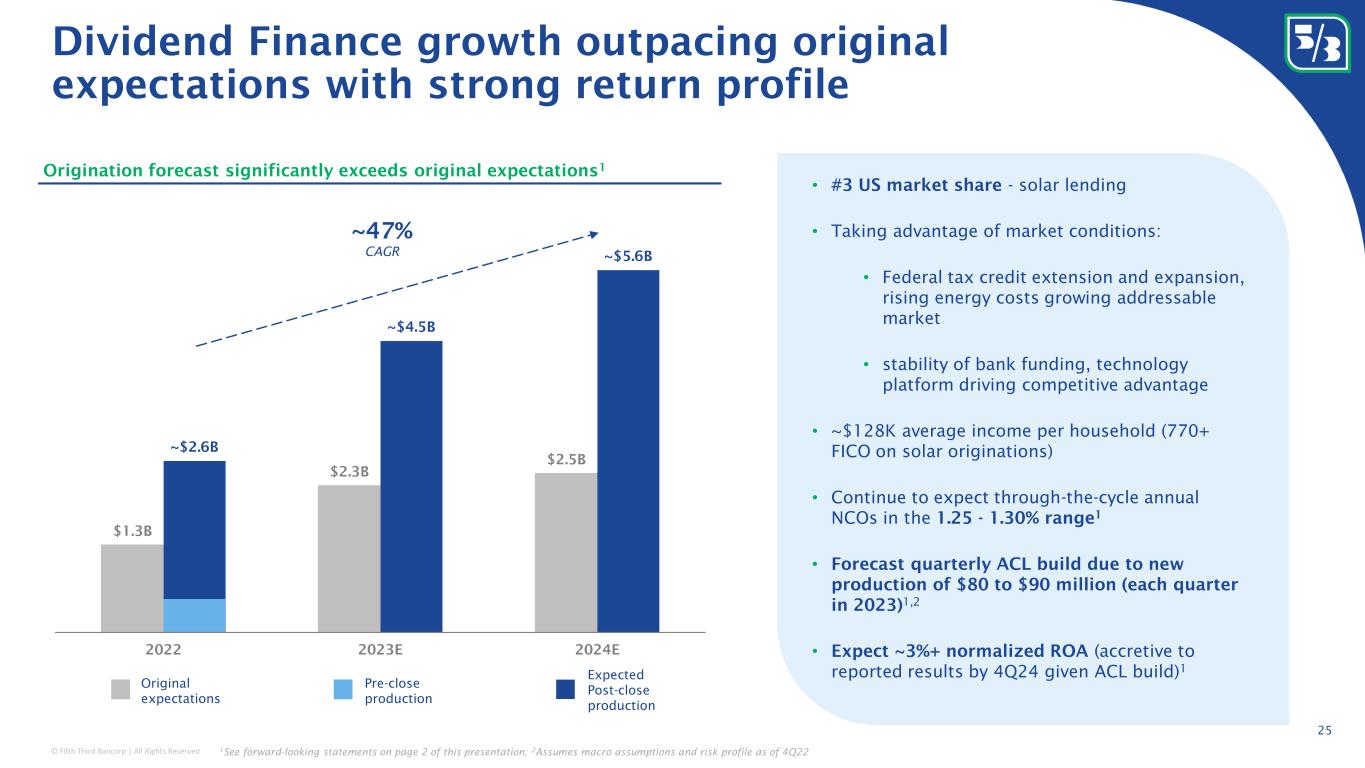 © Fifth Third Bancorp | All Rights Reserved ~$24BN in sustainable financing towards $100BN goal 208 due diligence reviews for sensitive sectors in compliance with E&S Risk Management Framework 1 52% reduction in Scope 1 and 2 GHG emissions since 2014 4 100% renewable energy purchased since 2019 Achieved carbon neutrality in our operations since 2020 6 $500MM inaugural Green Bond issued in October 2021 8 24 Addressing climate change Promoting inclusion and diversity Demonstrating our commitment to employees Strengthening our communities Keeping the customer at the center $180MM Neighborhood Investment Program in nine majority-Black communities $1.2BN provided in community development lending and investment 3 $39.2MM in charitable donations to support communities ~3MM people educated through our LIFE programs 7 ~118K hours of community service and $6MM in employee giving $20/hour minimum wage with over 40% of workforce receiving mid-year compensation increase Up to 7% 401(k) employer contribution with 80% participation ~776K hours of training (40 hours average / FTE) Decrease in overall turnover from 21.2% in 2021, to 21.0% in 2022 New flexible PTO policy including volunteer paid time away for full-time (8 hours) and part-time (4 hours) employees 12MM customer outreach calls, continuing our heightened connection to the customer 2.5% consumer household growth Low reliance on punitive consumer fees, with $13MM in NSF fees eliminated and $39MM in overdraft fees avoided with Extra Time ® $27BN deposited up to 2 days early with Early Pay ® $26MM in consumer cash back rewards with 5/3 Cash/Back cards 22% reduction in monthly complaint volume since 2019 $2.7BN delivered towards $2.8BN accelerating racial equality, equity and inclusion initiative since 2021 38% board diversity 2 58% women; 28% persons of color in workforce >99% pay equity for women and minorities 5 $119MM Tier 1 diverse supplier spend, over 11% of net addressable spend Launched employee Sustainability Business Resource Group in June 2022 Fifth Third is committed to supporting customers, communities and employees Sustainability priorities and metrics 1 Data is for 9/23/2020 through 12/31/2022. The Environmental and Social Risk Management Framework (previously Environmental and Social Policy) can be found at https://ir.53.com/esg/enviromental/ 2 In terms of ethnicity or gender 3 Preliminary 4 Data is through 9/30/2022 5 Refer to the 2021 ESG report for additional details on methodology. 6 For Scope 1, Scope 2 and business travel under Scope 3 emissions. Projected full year 2022 CO2e emissions are based on 2022 year-to-date data as well as historical company data from 2014-2021. Final CO2e emissions will be made available in 2023 following independent verification. 7 Since 2004 8 Sustainable Bond Report can be found at https://ir.53.com/esg/Sustainable-Bonds/.