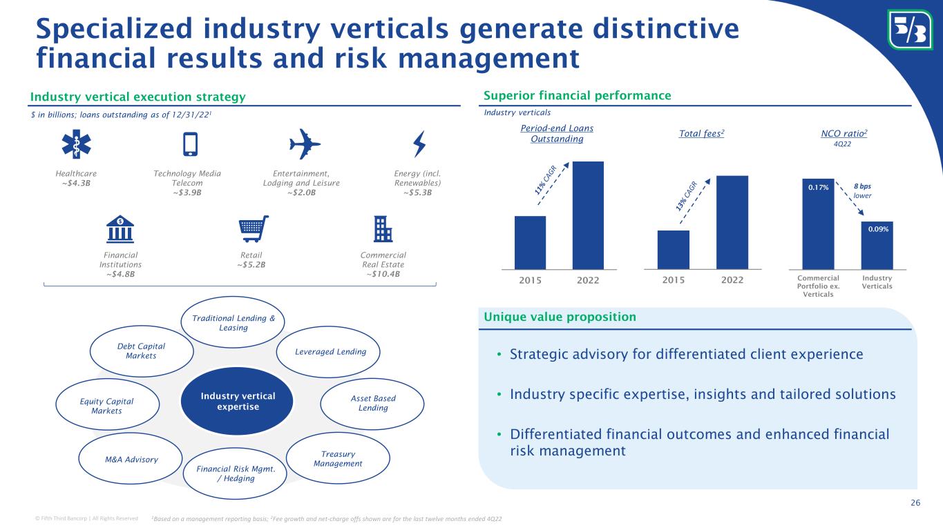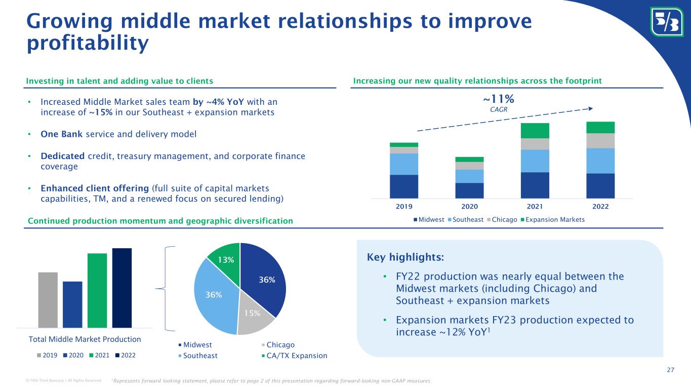 © Fifth Third Bancorp | All Rights Reserved 2015 2022 Healthcare ~$4.3B Energy (incl. Renewables) ~$5.3B Entertainment, Lodging and Leisure ~$2.0B Retail ~$5.2B Technology Media Telecom ~$3.9B Financial Institutions ~$4.8B Commercial Real Estate ~$10.4B Unique value proposition • Strategic advisory for differentiated client experience • Industry specific expertise, insights and tailored solutions • Differentiated financial outcomes and enhanced financial risk management Superior financial performanceIndustry vertical execution strategy 2015 2022 Industry verticals Total fees 2 NCO ratio 2 0.17% 0.09% Commercial Portfolio ex. Verticals Industry Verticals $ in billions; loans outstanding as of 12/31/22 1 1Based on a management reporting basis; 2Fee growth and net-charge offs shown are for the last twelve months ended 4Q22 Period-end Loans Outstanding 4Q22 Industry vertical expertise Asset Based Lending Debt Capital Markets Treasury Management Financial Risk Mgmt. / Hedging M&A Advisory Leveraged Lending Equity Capital Markets Traditional Lending & Leasing 8 bps lower Specialized industry verticals generate distinctive financial results and risk management 26