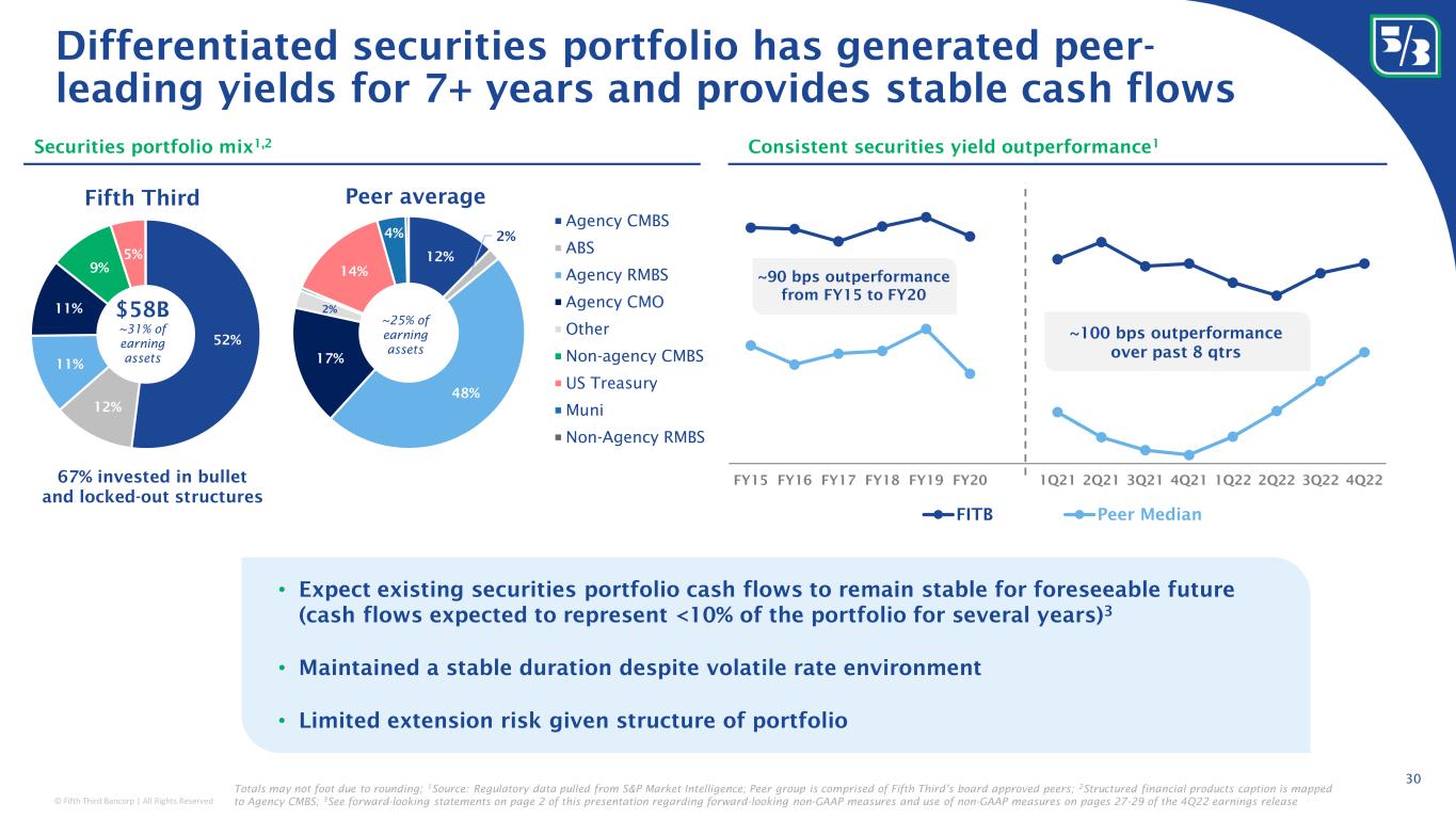 © Fifth Third Bancorp | All Rights Reserved 37% 39% 9% 11% 4% 75% 14% 7% 4% • 66% allocation to bullet/ locked- out cash flow securities • AFS yield: 2.97% 5 • Effective duration of 5.36 6 • Net unrealized pre-tax loss: $6.0BN • 99% AFS 11 $24.6BN fixed 3 | $51.7BN variable 1,2 Commercial loans 1,2,3 Balance sheet positioning as of 12/31/22 29 0% 100% Fix | 0% Variable 85% Fix | 15% Variable Investment portfolioConsumer loans 1 Long-term debt 4 $36.8BN fixed | $8.3BN variable 1 $7.6BN fixed | $6.1BN variable 4 • 1M based: 45% 7, 12 • 3M based: 6% 7, 12 • Prime & O/N based: 15% 7,12 • Other based: 1% 7,10, 12 • Weighted avg. life: 1.9 years 1,3 • 1M based: 2% 8,12 • 12M based: 2% 8,12 • Prime: 12% 8 • Other based: 3% 8,12,13 • Weighted avg. life: 3.8 years 1 • 1M based: 15% 9 • 3M based: 7% 9 • SOFR based: 22% • Weighted avg. life: 4.6 years C&I 27% Fix | 73% Variable Coml. mortgage 41% Fix | 59% Variable Coml. lease 100% Fix | 0% Variable Resi mtg.& construction 90% Fix | 10% Variable Home equity 8% Fix | 92% Variable Senior debt 52% Fix | 48% Variable Sub debt 65% Fix | 35% Variable Auto securiz. proceeds 100% Fix | 0% Variable Coml. construction 33% Fix | 67% Variable Credit card 40% Fix | 60% Variable Other 79% Fix | 21% Variable Other 85% Fix | 15% Variable Level 1 100% Fix | 0% Variable Level 2A Non-HQLA/ Other • The information above incorporates the impact of $12BN in active cash flow hedges ($8BN in C&I receive-fixed swaps and $4BN in CRE receive-fixed swaps) and ~$6.0BN fair value hedges associated with long-term debt (receive-fixed swaps). • The impacts of PPP loans (given the expected temporary nature) are excluded Includes $5.2BN non-agency CMBS (All super-senior, AAA-rated securities; 57.9% WA LTV, ~38.7% credit enhancement) Auto/Indirect 97% Fix | 3% Variable 23% 55% 22% 77% 20% 1% 2% 1 Excludes HFS Loans & Leases; 2 Fifth Third had $12B of commercial variable loans classified as fixed given the impacts of $8BN in C&I receive-fix swaps and $4BN in CRE receive-fix swaps; Excludes forward starting swaps & floors; Excludes$3BN in out-of-the-money floors with a 2.25% 1ML strike currently on the balance sheet; 3 Excludes ~$0.1BN in Small Business Administration Paycheck Protection Program (PPP) loans; 4 Fifth Third had $705MM 3mL receive-fix swaps, $2.25BN 1mL receive-fix swaps, and $3.0BN SOFR receive-fix swaps outstanding against long-term debt, which are being included in floating long-term debt; 5 Yield of the 4Q22 weighted average taxable and non-taxable (tax equivalent) available for sale portfolio; 6 Effective duration taxable and non-taxable available for sale portfolio; 7 As a percent of total commercial, excluding PPP loans; 8 As a percent of total consumer; 9 As a percent of par; 10 Includes 12M term, 6M term, and Fed Funds based loans; 11 Excludes equity securities; 12 Term points include LIBOR, SOFR, BSBY, AMERIBOR, Treasuries & FX curves; 13 Includes overnight term, 3M term, 6M term, 12M term and Fed Funds