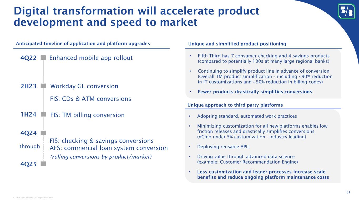 © Fifth Third Bancorp | All Rights Reserved 31 Anticipated timeline of application and platform upgrades Enhanced mobile app rollout Workday GL conversion FIS: CDs & ATM conversions 4Q22 2H23 4Q24 FIS: checking & savings conversions AFS: commercial loan system conversion 4Q25 Unique and simplified product positioning Unique approach to third party platforms • Fifth Third has 7 consumer checking and 4 savings products (compared to potentially 100s at many large regional banks) • Continuing to simplify product line in advance of conversion (Overall TM product simplification – including ~90% reduction in IT customizations and ~50% reduction in billing codes) • Fewer products drastically simplifies conversions • Adopting standard, automated work practices • Minimizing customization for all new platforms enables low friction releases and drastically simplifies conversions (nCino under 5% customization - industry leading) • Deploying reusable APIs • Driving value through advanced data science (example: Customer Recommendation Engine) • Less customization and leaner processes increase scale benefits and reduce ongoing platform maintenance costs Digital transformation will accelerate product development and speed to market 1H24 FIS: TM billing conversion through (rolling conversions by product/market)