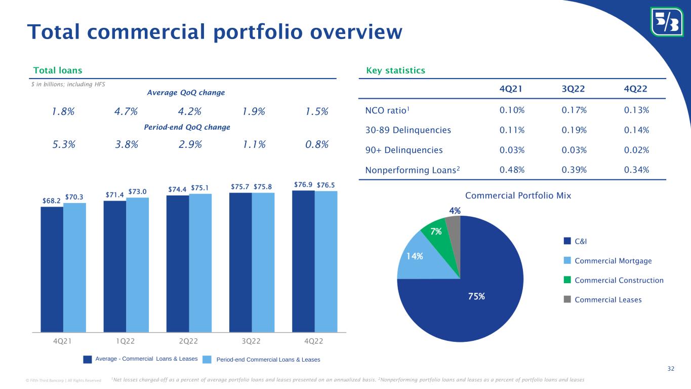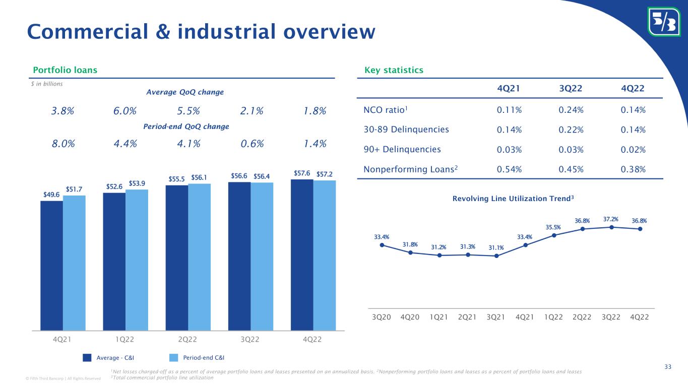 © Fifth Third Bancorp | All Rights Reserved 4Q21 3Q22 4Q22 NCO ratio 1 0.10% 0.17% 0.13% 30-89 Delinquencies 0.11% 0.19% 0.14% 90+ Delinquencies 0.03% 0.03% 0.02% Nonperforming Loans 2 0.48% 0.39% 0.34% 32 Total loans $ in billions; including HFS Period-end QoQ change Average QoQ change Key statistics Total commercial portfolio overview 1.8% 4.7% 4.2% 1.9% 1.5% 5.3% 3.8% 2.9% 1.1% 0.8% Average - Commercial Loans & Leases Period-end Commercial Loans & Leases 1 Net losses charged-off as a percent of average portfolio loans and leases presented on an annualized basis. 2 Nonperforming portfolio loans and leases as a percent of portfolio loans and leases