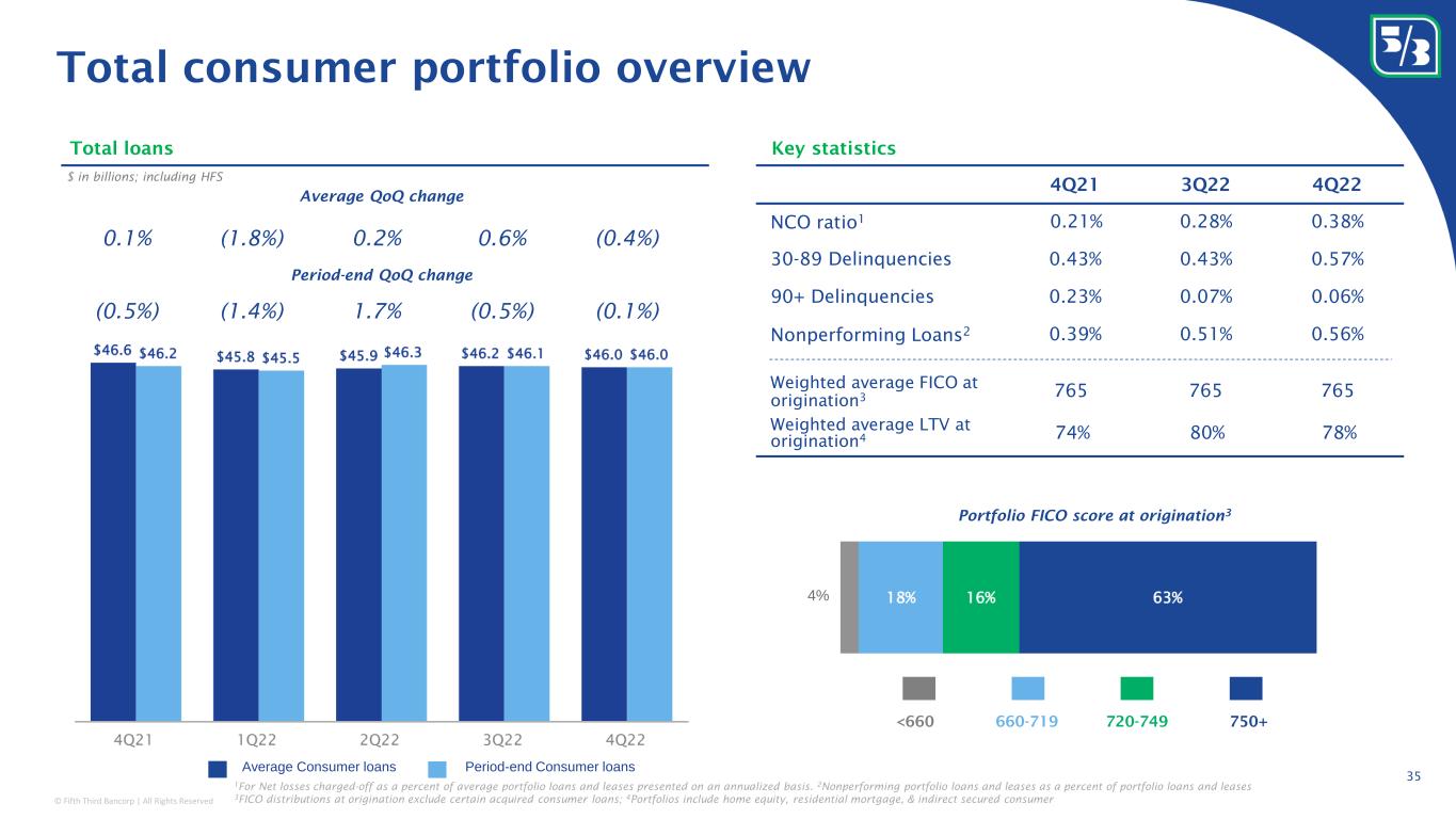 © Fifth Third Bancorp | All Rights Reserved Classification: Internal Use 4Q21 3Q22 4Q22 NCO ratio 1 0.03% (0.03%) 0.00% 30-89 Delinquencies 0.03% 0.10% 0.16% 90+ Delinquencies 0.01% 0.00% 0.00% Nonperforming Loans 2 0.35% 0.25% 0.29% Commercial real estate overview 34 CRE Mortgage Balance by owner occupancy CRE Construction Balance by property type Average – Commercial Mortgage Average – Commercial Construction Period-end – Commercial Mortgage Period-end – Commercial Construction Portfolio loans Key statistics Period-end QoQ change Average QoQ change 1 Net losses charged-off as a percent of average portfolio loans and leases presented on an annualized basis. 2 Nonperforming portfolio loans and leases as a percent of portfolio loans and leases $ in billions (1.3%) 3.6% (0.1%) 2.6% (0.4%) (2.9%) 2.0% 1.1% 1.5% 0.8% Multifamily Other Retail Hospitality Office Industrial Home Builder Non-Owner Occupied Owner Occupied 4Q21 1Q22 2Q22 3Q22 4Q22