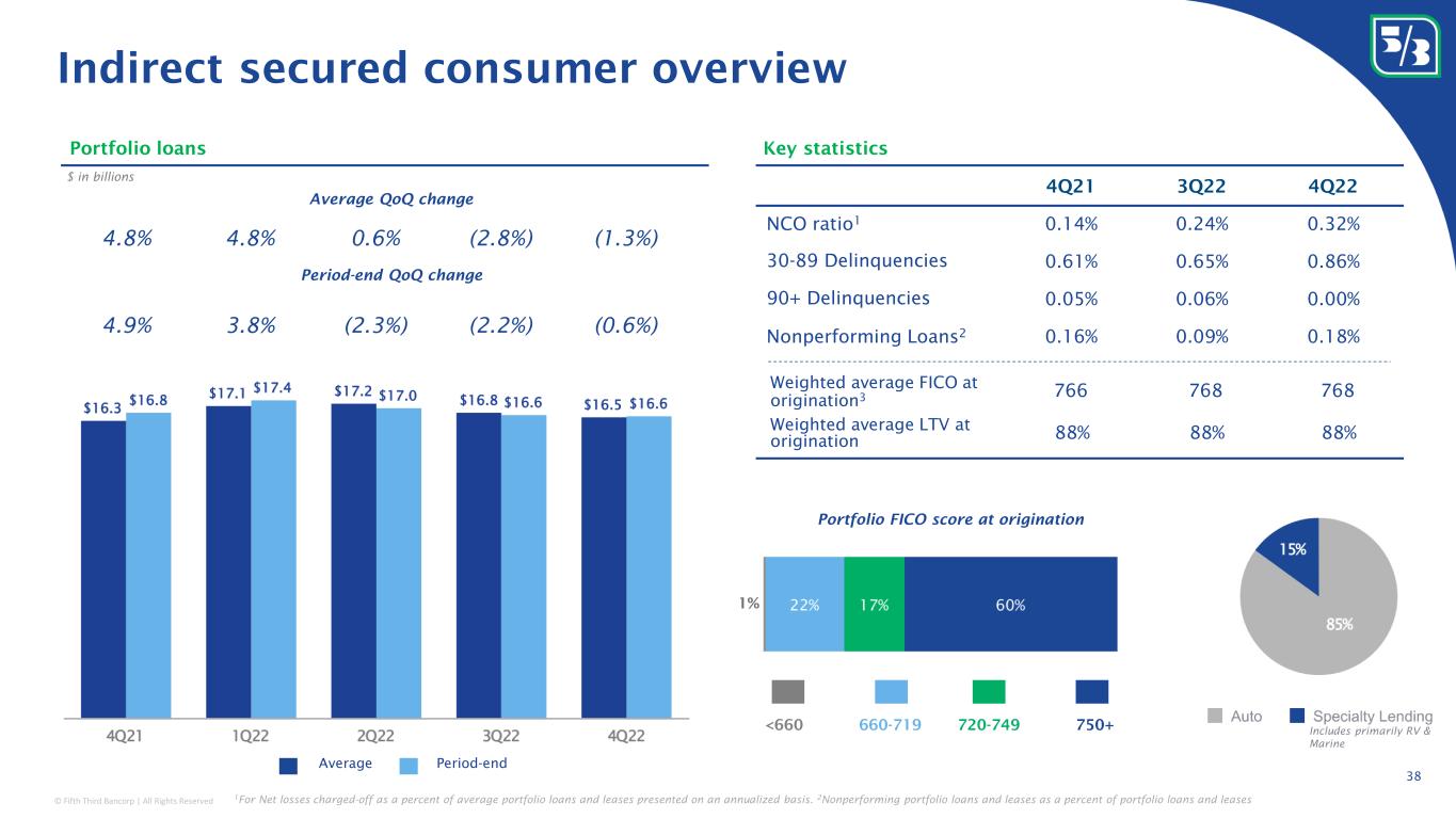 © Fifth Third Bancorp | All Rights Reserved Classification: Internal Use 4Q21 3Q22 4Q22 NCO ratio 1 (0.18%) (0.08%) 0.02% 30-89 Delinquencies 0.61% 0.55% 0.74% 90+ Delinquencies 0.02% 0.03% 0.02% Nonperforming Loans 2 1.89% 1.70% 1.66% Weighted average FICO at origination 3 763 767 767 Weighted average LTV at origination 68% 67% 67% Home equity overview 37 Portfolio FICO score at origination 3 $ in billions Portfolio loans Key statistics Period-end QoQ change Average QoQ change (5.2%) (4.1%) (2.8%) 1.6% 1.7% (4.5%) (4.1%) (0.3%) 2.4% 1.0% 750+720-749<660 660-719 2% Period-endAverage 1 For Net losses charged-off as a percent of average portfolio loans and leases presented on an annualized basis. 2 Nonperforming portfolio loans and leases as a percent of portfolio loans and leases 3 FICO distributions at origination exclude certain acquired home equity loans