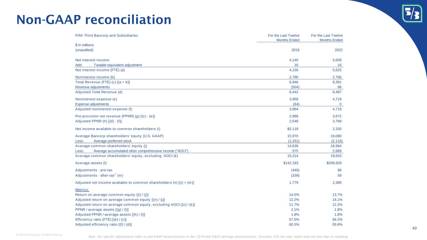 © Fifth Third Bancorp | All Rights Reserved 40 Non-GAAP reconciliation Note: For specific adjustments refer to non-GAAP reconciliations in the 1Q19 and 4Q22 earnings presentations; 1 Assumes 23% tax rate; totals may not foot due to rounding Fifth Third Bancorp and Subsidiaries For the Last Twelve Months Ended For the Last Twelve Months Ended $ in millions (unaudited) 2018 2022 Net interest income 4,140 5,609 Add: Taxable equivalent adjustment 16 16 Net interest income (FTE) (a) 4,156 5,625 Noninterest income (b) 2,790 2,766 Total Revenue (FTE) (c) [(a + b)] 6,946 8,391 Revenue adjustments (504) 96 Adjusted Total Revenue (d) 6,442 8,487 Noninterest expense (e) 3,958 4,719 Expense adjustments (64) 0 Adjusted noninterest expense (f) 3,894 4,719 Pre-provision net revenue (PPNR) (g) [(c) - (e)] 2,988 3,672 Adjusted PPNR (h) [(d) - (f)] 2,548 3,768 Net income available to common shareholders (i) $2,118 2,330 Average Bancorp shareholders' equity (U.S. GAAP) 15,970 19,080 Less: Average preferred stock (1,331) (2,116) Average common shareholders' equity (j) 14,639 16,964 Less: Average accumulated other comprehensive income ("AOCI") 575 2,689 Average common shareholders' equity, excluding AOCI (k) 15,214 19,653 Average assets (l) $142,183 $206,929 Adjustments - pre-tax (440) 96 Adjustments - after-tax 1 (m) (339) 59 Adjusted net income available to common shareholders (n) [(i) + (m)] 1,779 2,389 Metrics: Return on average common equity [(i) / (j)] 14.5% 13.7% Adjusted return on average common equity [(n) / (j)] 12.2% 14.1% Adjusted return on average common equity, excluding AOCI [(n) / (k)] 11.7% 12.2% PPNR / average assets [(g) / (l)] 2.1% 1.8% Adjusted PPNR / average assets [(h) / (l)] 1.8% 1.8% Efficiency ratio (FTE) [(e) / (c)] 57.0% 56.2% Adjusted efficiency ratio [(f) / (d)] 60.5% 55.6%