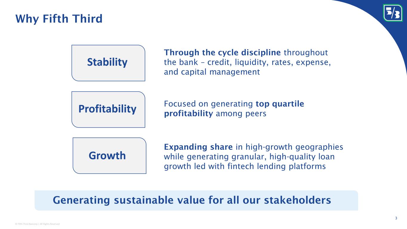 © Fifth Third Bancorp | All Rights Reserved Cautionary statement 2 This presentation contains statements that we believe are “forward-looking statements” within the meaning of Section 27A of the Securities Act of 1933, as amended, and Rule 175 promulgated thereunder, and Section 21E of the Securities Exchange Act of 1934, as amended, and Rule 3b-6 promulgated thereunder. All statements other than statements of historical fact are forward-looking statements. These statements relate to our financial condition, results of operations, plans, objectives, future performance, capital actions or business. They usually can be identified by the use of forward-looking language such as “will likely result,” “may,” “are expected to,” “is anticipated,” “potential,” “estimate,” “forecast,” “projected,” “intends to,” or may include other similar words or phrases such as “believes,” “plans,” “trend,” “objective,” “continue,” “remain,” or similar expressions, or future or conditional verbs such as “will,” “would,” “should,” “could,” “might,” “can,” or similar verbs. You should not place undue reliance on these statements, as they are subject to risks and uncertainties, including but not limited to the risk factors set forth in our most recent Annual Report on Form 10-K as updated by our filings with the U.S. Securities and Exchange Commission (“SEC”). There are a number of important factors that could cause future results to differ materially from historical performance and these forward-looking statements. Factors that might cause such a difference include, but are not limited to: (1) effects of the global COVID-19 pandemic; (2) deteriorating credit quality; (3) loan concentration by location or industry of borrowers or collateral; (4) problems encountered by other financial institutions; (5) inadequate sources of funding or liquidity; (6) unfavorable actions of rating agencies; (7) inability to maintain or grow deposits; (8) limitations on the ability to receive dividends from subsidiaries; (9) cyber-security risks; (10) Fifth Third’s ability to secure confidential information and deliver products and services through the use of computer systems and telecommunications networks; (11) failures by third-party service providers; (12) inability to manage strategic initiatives and/or organizational changes; (13) inability to implement technology system enhancements; (14) failure of internal controls and other risk management systems; (15) losses related to fraud, theft, misappropriation or violence; (16) inability to attract and retain skilled personnel; (17) adverse impacts of government regulation; (18) governmental or regulatory changes or other actions; (19) failures to meet applicable capital requirements; (20) regulatory objections to Fifth Third’s capital plan; (21) regulation of Fifth Third’s derivatives activities; (22) deposit insurance premiums; (23) assessments for the orderly liquidation fund; (24) replacement of LIBOR; (25) weakness in the national or local economies; (26) global political and economic uncertainty or negative actions; (27) changes in interest rates and the effects of inflation; (28) changes and trends in capital markets; (29) fluctuation of Fifth Third’s stock price; (30) volatility in mortgage banking revenue; (31) litigation, investigations, and enforcement proceedings by governmental authorities; (32) breaches of contractual covenants, representations and warranties; (33) competition and changes in the financial services industry; (34) changing retail distribution strategies, customer preferences and behavior; (35) difficulties in identifying, acquiring or integrating suitable strategic partnerships, investments or acquisitions; (36) potential dilution from future acquisitions; (37) loss of income and/or difficulties encountered in the sale and separation of businesses, investments or other assets; (38) results of investments or acquired entities; (39) changes in accounting standards or interpretation or declines in the value of Fifth Third’s goodwill or other intangible assets; (40) inaccuracies or other failures from the use of models; (41) effects of critical accounting policies and judgments or the use of inaccurate estimates; (42) weather-related events, other natural disasters, or health emergencies (including pandemics); (43) the impact of reputational risk created by these or other developments on such matters as business generation and retention, funding and liquidity; (44) changes in law or requirements imposed by Fifth Third’s regulators impacting our capital actions, including dividend payments and stock repurchases; and (45) Fifth Third's ability to meet its environmental and/or social targets, goals and commitments. You should refer to our periodic and current reports filed with the Securities and Exchange Commission, or “SEC,” for further information on other factors, which could cause actual results to be significantly different from those expressed or implied by these forward-looking statements. Moreover, you should treat these statements as speaking only as of the date they are made and based only on information then actually known to us. We expressly disclaim any obligation or undertaking to release publicly any updates or revisions to any forward-looking statements contained herein to reflect any change in our expectations or any changes in events, conditions or circumstances on which any such statement is based, except as may be required by law, and we claim the protection of the safe harbor for forward-looking statements contained in the Private Securities Litigation Reform Act of 1995. The information contained herein is intended to be reviewed in its totality, and any stipulations, conditions or provisos that apply to a given piece of information in one part of this press release should be read as applying mutatis mutandis to every other instanc