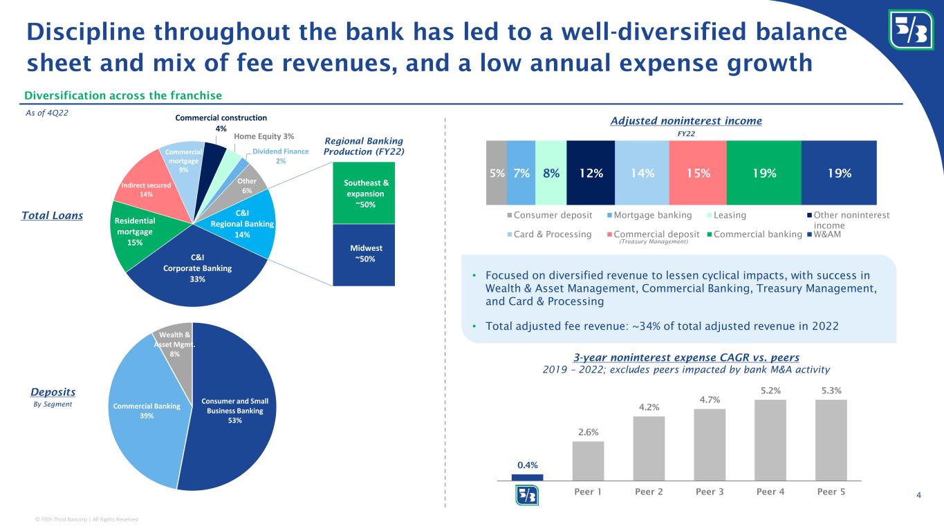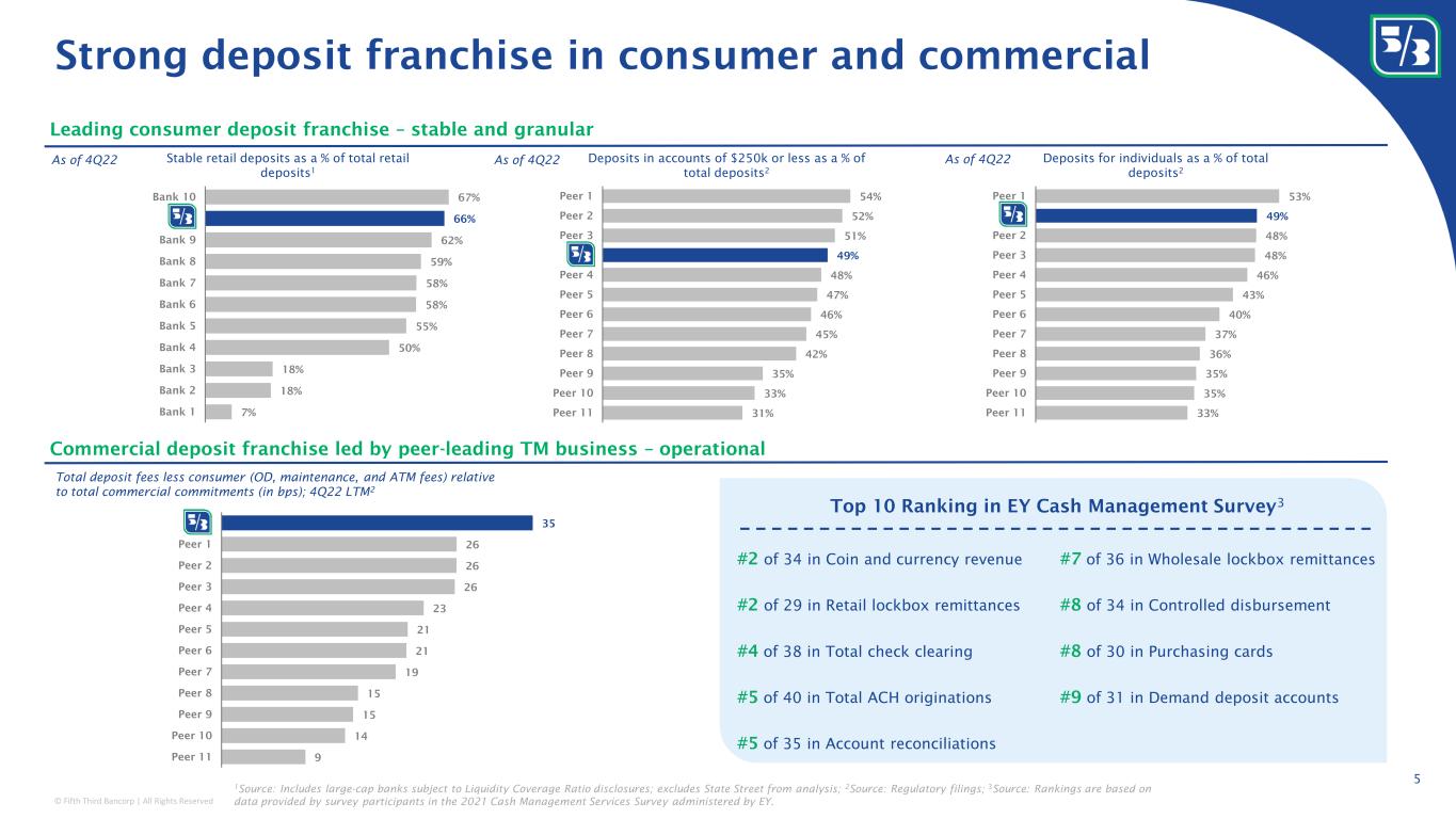 © Fifth Third Bancorp | All Rights Reserved Southeast & expansion ~50% Midwest ~50%C&I Corporate Banking 33% Residential mortgage 15% Indirect secured 14% Commercial mortgage 9% Commercial construction 4% Home Equity 3% Dividend Finance 2% Other 6% C&I Regional Banking 14% Consumer and Small Business Banking 53% Commercial Banking 39% Wealth & Asset Mgmt. 8% 5% 7% 8% 12% 14% 15% 19% 19% Consumer deposit Mortgage banking Leasing Other noninterest income Card & Processing Commercial deposit Commercial banking W&AM Discipline throughout the bank has led to a well-diversified balance sheet and mix of fee revenues, and a low annual expense growth Diversification across the franchise Adjusted noninterest income FY22 4 Regional Banking Production (FY22) • Focused on diversified revenue to lessen cyclical impacts, with success in Wealth & Asset Management, Commercial Banking, Treasury Management, and Card & Processing • Total adjusted fee revenue: ~34% of total adjusted revenue in 2022 Deposits By Segment Total Loans As of 4Q22 (Treasury Management) 3-year noninterest expense CAGR vs. peers 2019 – 2022; excludes peers impacted by bank M&A activity 0.4% 2.6% 4.2% 4.7% 5.2% 5.3% X Peer 1 Peer 2 Peer 3 Peer 4 Peer 5