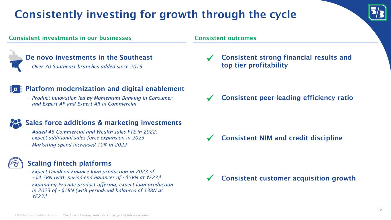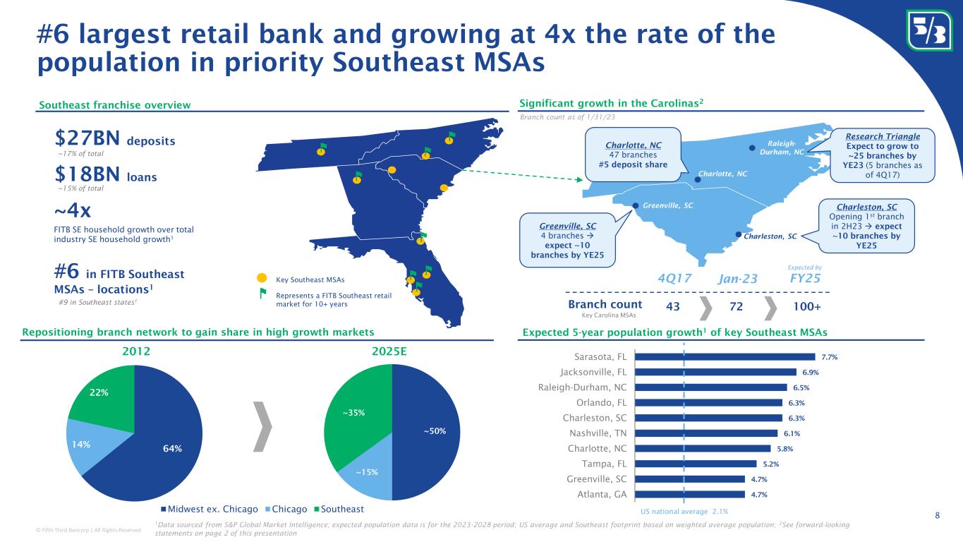 © Fifth Third Bancorp | All Rights Reserved #6 largest retail bank and growing at 4x the rate of the population in priority Southeast MSAs Charleston, SC Opening 1 st branch in 2H23 → expect ~10 branches by YE25 64% 14% 22% Midwest ex. Chicago Chicago Southeast 8 Key Southeast MSAs Represents a FITB Southeast retail market for 10+ years Repositioning branch network to gain share in high growth markets Southeast franchise overview 4.7% 4.7% 5.2% 5.8% 6.1% 6.3% 6.3% 6.5% 6.9% 7.7% Atlanta, GA Greenville, SC Tampa, FL Charlotte, NC Nashville, TN Charleston, SC Orlando, FL Raleigh-Durham, NC Jacksonville, FL Sarasota, FL Expected 5-year population growth 1 of key Southeast MSAs US national average 2.1% Significant growth in the Carolinas 2 Raleigh- Durham, NC Charleston, SC Greenville, SC Charlotte, NC FY254Q17 100+ Expected by Branch count Jan-23 ~50% ~15% ~35% 2012 2025E $27BN deposits $18BN loans ~4x FITB SE household growth over total industry SE household growth 1 #6 in FITB Southeast MSAs – locations 1 #9 in Southeast states 1 Key Carolina MSAs 43 72 Greenville, SC 4 branches → expect ~10 branches by YE25 Research Triangle Expect to grow to ~25 branches by YE23 (5 branches as of 4Q17) Charlotte, NC 47 branches #5 deposit share 1 Data sourced from S&P Global Market Intelligence; expected population data is for the 2023-2028 period; US average and Southeast footprint based on weighted average population; 2 See forward-looking statements on page 2 of this presentation Branch count as of 1/31/23 ~17% of total ~15% of total
