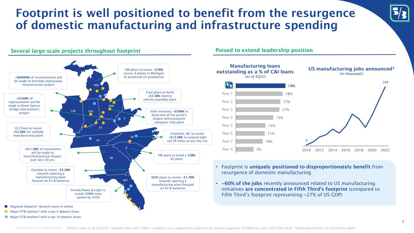 © Fifth Third Bancorp | All Rights Reserved 6 1 See forward-looking statements on page 2 of this presentation Consistently investing for growth through the cycle Consistent strong financial results and top tier profitability Consistent NIM and credit discipline Consistent customer acquisition growth Consistent peer-leading efficiency ratio De novo investments in the Southeast Sales force additions & marketing investments Scaling fintech platforms Platform modernization and digital enablement Consistent outcomesConsistent investments in our businesses • Over 70 Southeast branches added since 2019 • Product innovation led by Momentum Banking in Consumer and Expert AP and Expert AR in Commercial • Added 45 Commercial and Wealth sales FTE in 2022; expect additional sales force expansion in 2023 • Marketing spend increased 10% in 2022 • Expect Dividend Finance loan production in 2023 of ~$4.5BN (with period-end balances of ~$5BN at YE23) 1 • Expanding Provide product offering; expect loan production in 2023 of ~$1BN (with period-end balances of $3BN at YE23) 1