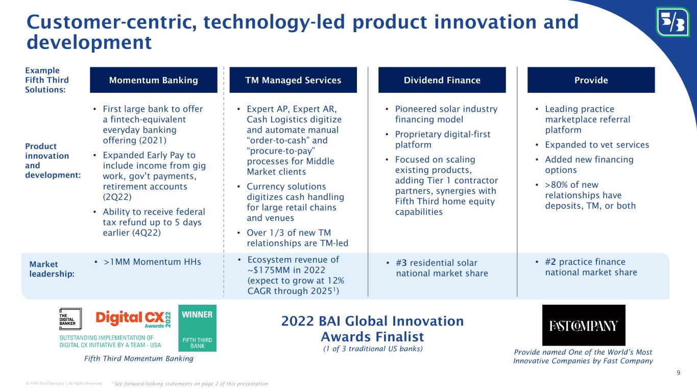 © Fifth Third Bancorp | All Rights Reserved 9 Example Fifth Third Solutions: Product innovation and development: Market leadership: • #3 residential solar national market share • #2 practice finance national market share • Ecosystem revenue of ~$175MM in 2022 (expect to grow at 12% CAGR through 2025 1 ) • >1MM Momentum HHs Momentum Banking Dividend Finance ProvideTM Managed Services • Pioneered solar industry financing model • Proprietary digital-first platform • Focused on scaling existing products, adding Tier 1 contractor partners, synergies with Fifth Third home equity capabilities • Leading practice marketplace referral platform • Expanded to vet services • Added new financing options • >80% of new relationships have deposits, TM, or both Customer-centric, technology-led product innovation and development 1 See forward-looking statements on page 2 of this presentation • First large bank to offer a fintech-equivalent everyday banking offering (2021) • Expanded Early Pay to include income from gig work, gov’t payments, retirement accounts (2Q22) • Ability to receive federal tax refund up to 5 days earlier (4Q22) • Expert AP, Expert AR, Cash Logistics digitize and automate manual “order-to-cash” and “procure-to-pay” processes for Middle Market clients • Currency solutions digitizes cash handling for large retail chains and venues • Over 1/3 of new TM relationships are TM-led 2022 BAI Global Innovation Awards Finalist (1 of 3 traditional US banks) Fifth Third Momentum Banking Provide named One of the World’s Most Innovative Companies by Fast Company