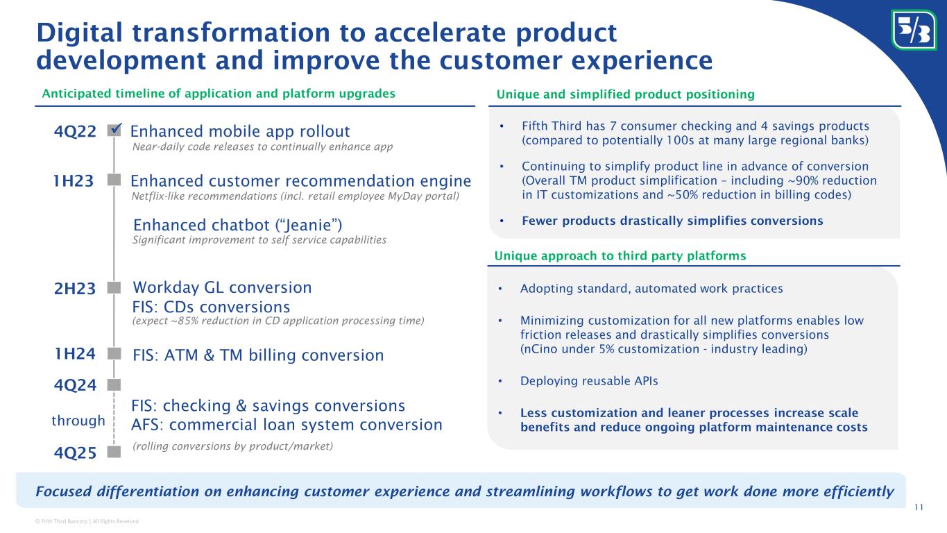 © Fifth Third Bancorp | All Rights Reserved Taking advantage of fintech disruption in healthcare managed services to support our broader strategic growth Healthcare provider revenue cycle management value chain Set up medical billing structure Enable pre- and point-of-care financial analysis Prepare and submit claims to payers Manage open medical claims Receive and reconcile payments from payers Bill patient for balance owed Receive and reconcile payments from patients Pay refunds owed to patients Focal point of fintech acquisition Acquisition of Big Data Healthcare to support strategic growth • Big Data Healthcare - Fintech focused on automated payment reconciliation solutions through intelligent data automation for healthcare providers • Further advances Fifth Third’s digital payments and managed services offerings • Industry leading, scalable platform replaces the need for highly manual labor and accelerates the revenue value chain for our healthcare clients • Catalyst to deepening treasury management relationships in our Healthcare vertical • Expected to be a driver for enhanced fee revenue and operational deposit generation Fifth Third Healthcare vertical at-a-glance • Fifth Third Healthcare was stood up in 2008 and is the longest tenured and most mature commercial vertical • ~$4.3BN 1 in loans as of 12/31/22 • Best in class M&A advisory capabilities • Consistently improved profitability through lending offerings as well as an increased focus on fee revenue 1 Represents balances generated from Fifth Third’s National Healthcare Vertical Group. 10